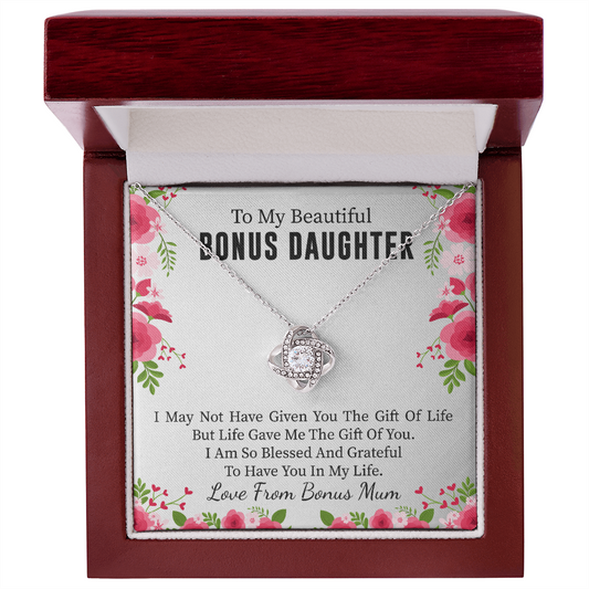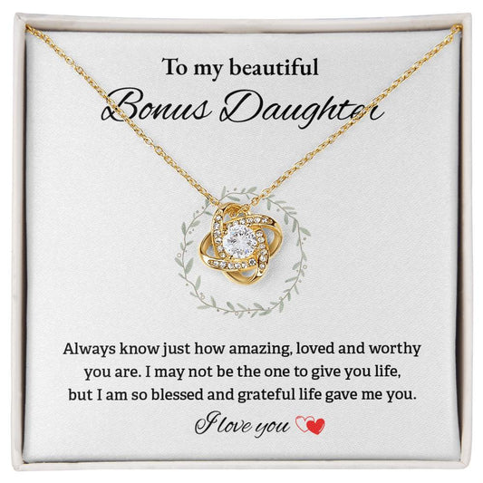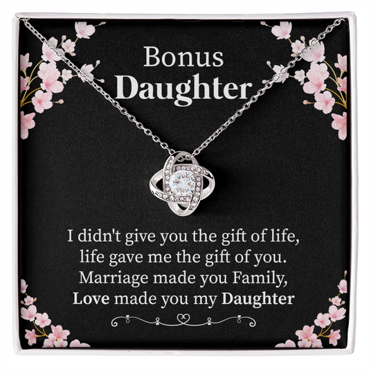 Bonus Daughter Necklace Gift from Stepmom or Stepfather – Love Knot Pendant with Meaningful Message Card