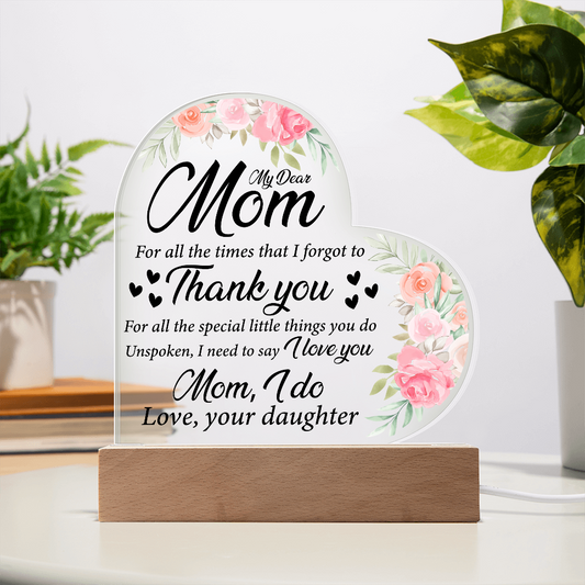 My Dear Mom Thank You Acrylic Heart Plaque Floral LED Light Heart Sign for Mom