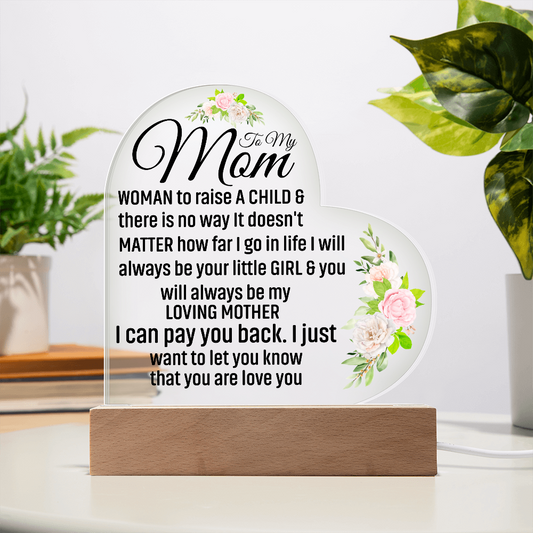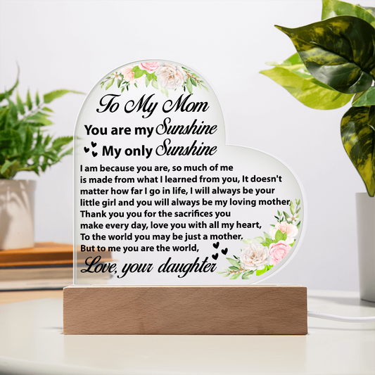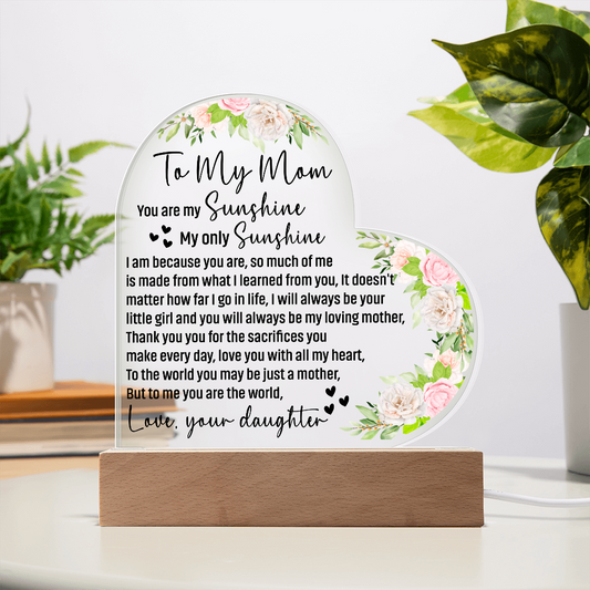 To My Mom Acrylic Heart Plaque Floral Design with LED Base