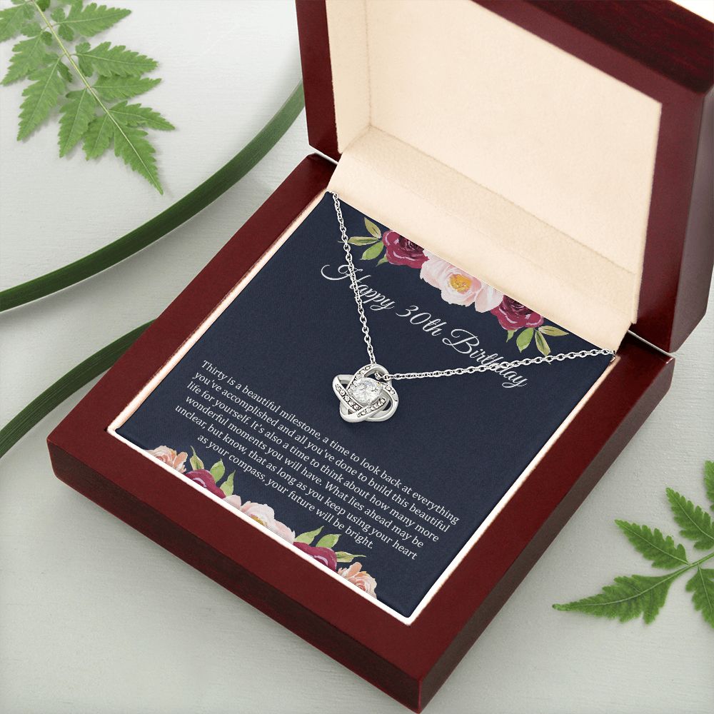 Make her 30th birthday special with an exclusive thoughtfulness jewelry gift that emphasizes the event. The love knot necklace is accompanied by a lovely floral message card, which makes it an excellent way of saying pride, love, and encouragement.