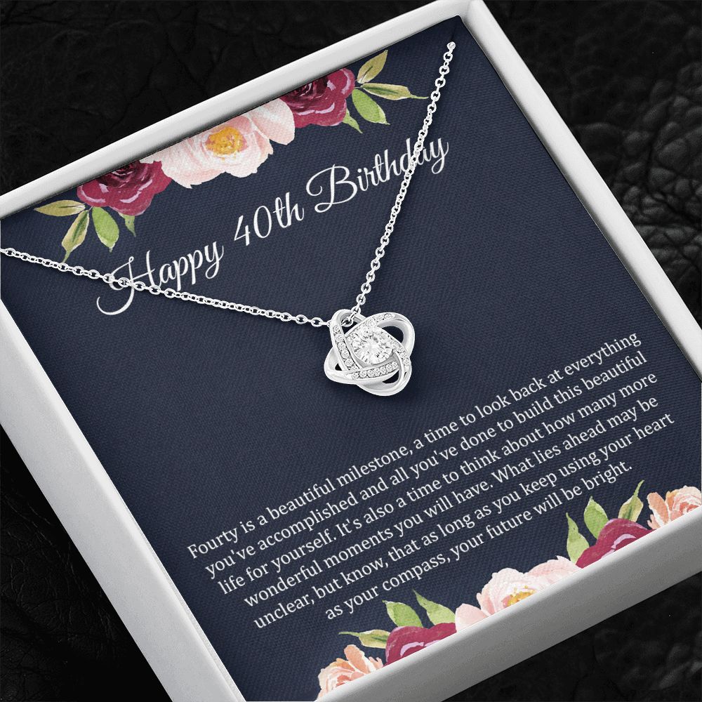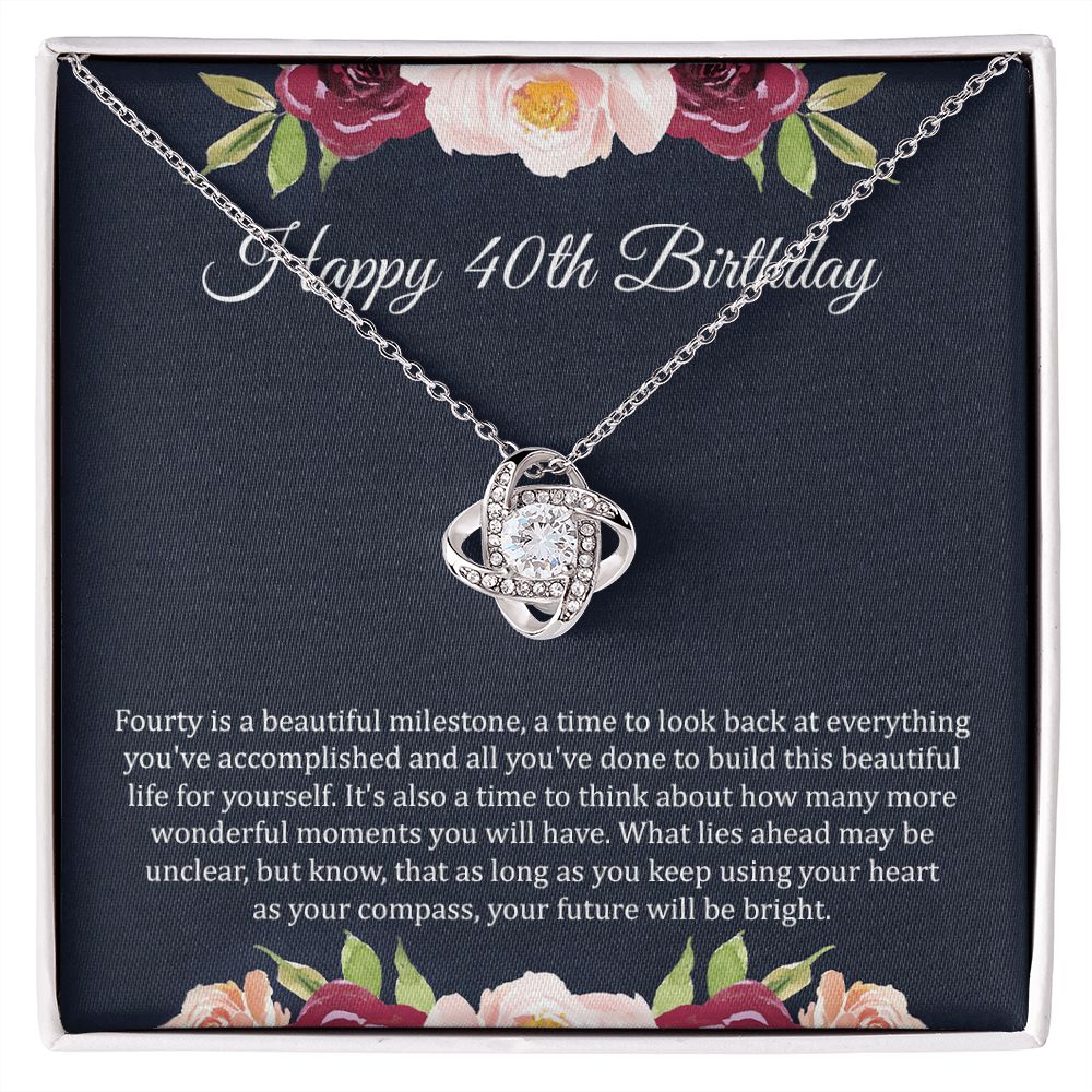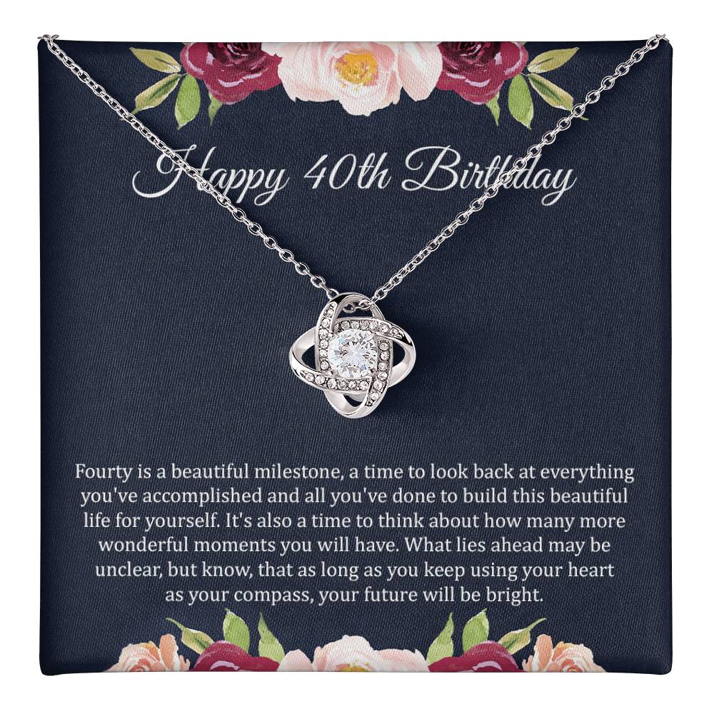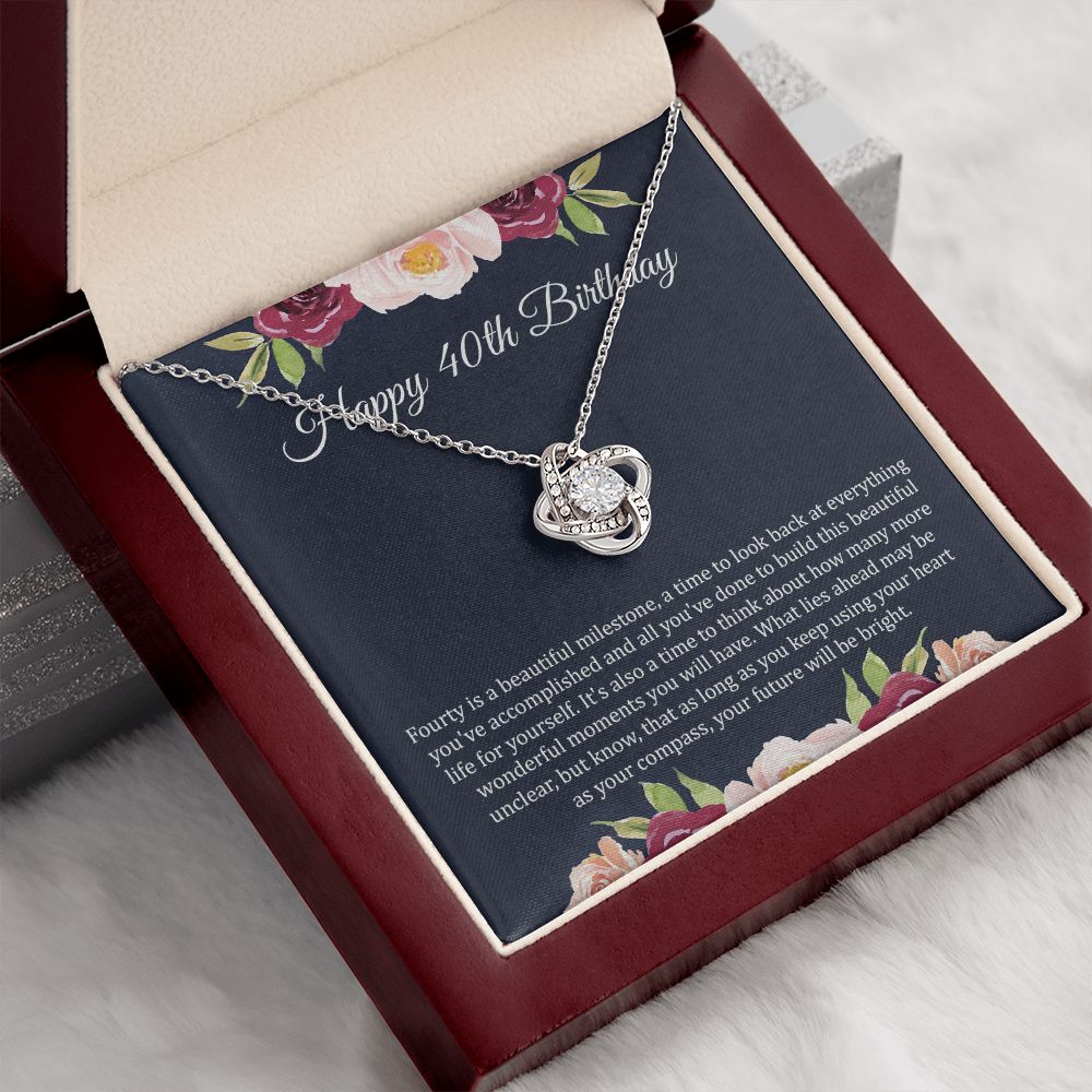 Celebrate the amazing forty with a gorgeous necklace that will celebrate her grace, power, and accomplishments. As part of this gift are a bright love knot pendant and a thoughtful floral message insert.