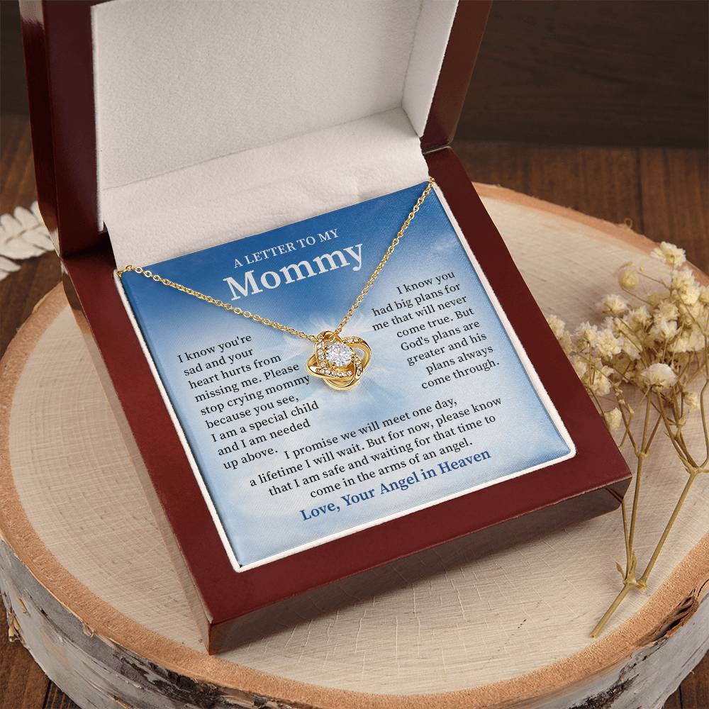 Honor a grieving mother's love and strength with this touching memorial necklace. Featuring a sparkling love knot pendant and a heartfelt message card titled "A Letter to My Mommy", this sympathy gift is a tender reminder that her angel baby is watching over her from heaven.