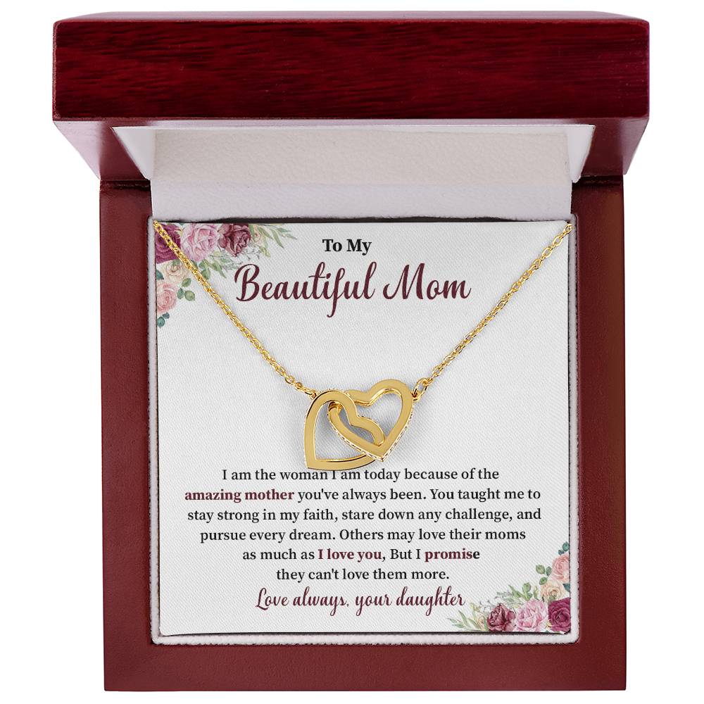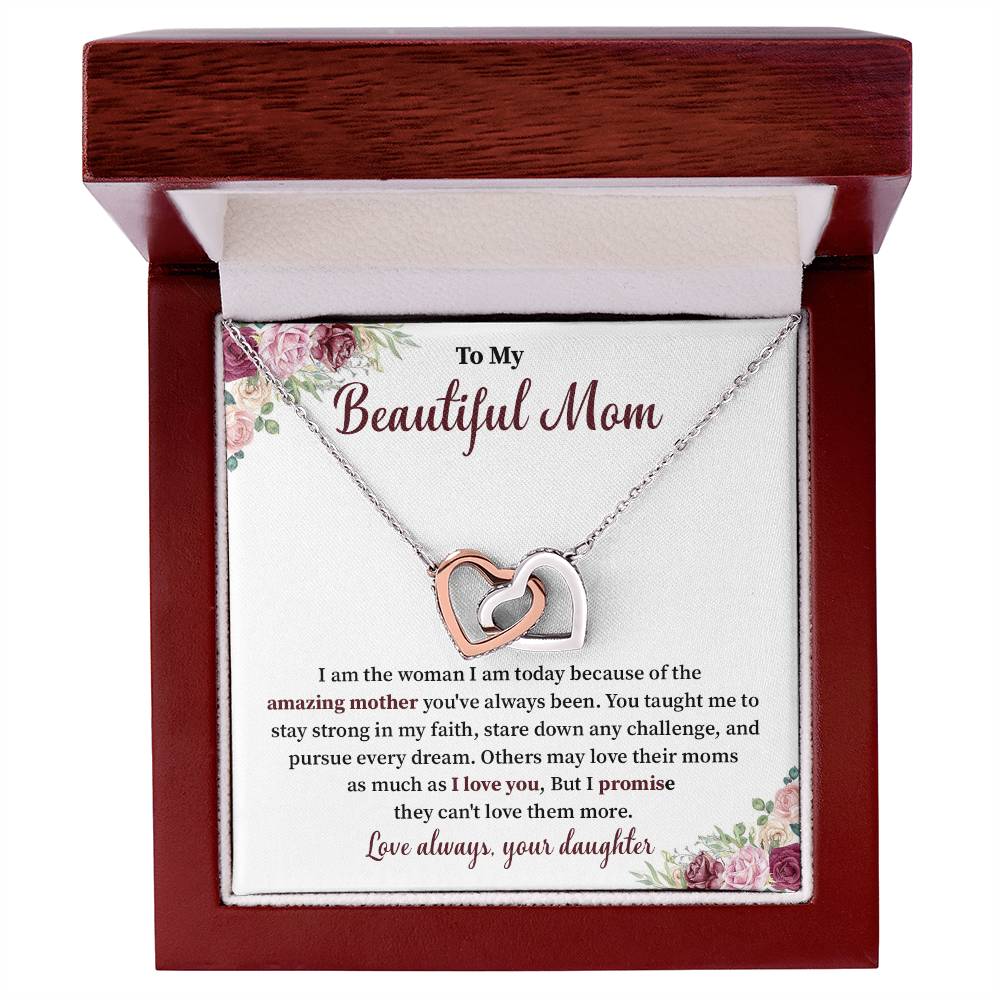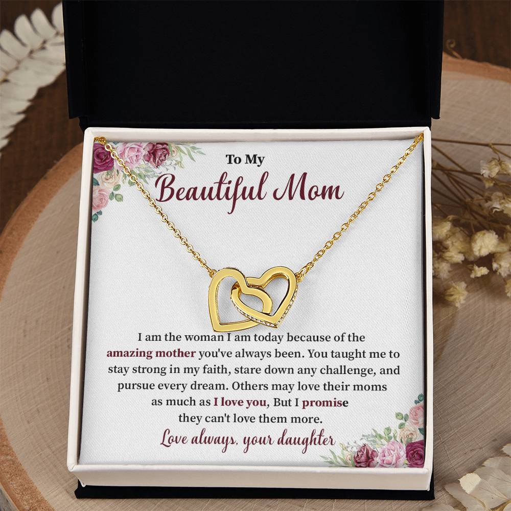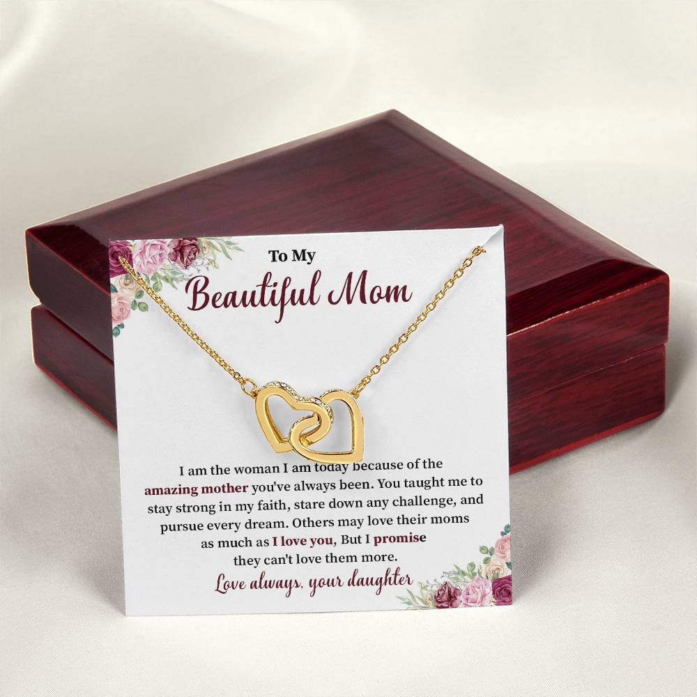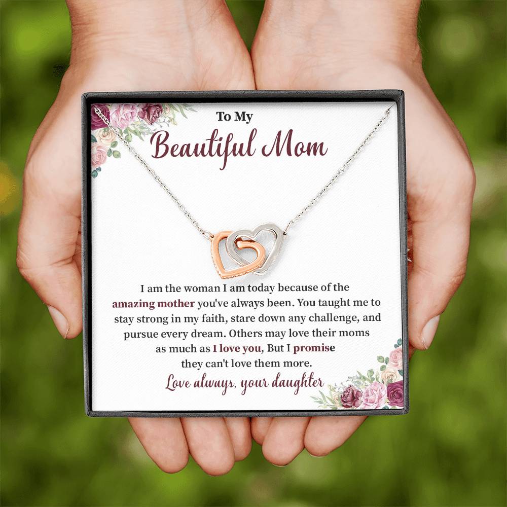The necklace is a great present of a daughter to a mother. It has an emotional message card and a gorgeous two-tone interlocking hearts pendant that are intended to celebrate the strength, advice, and unconditional love of all moms. A great gift on Mother Day, birthdays or simply to say I love you.