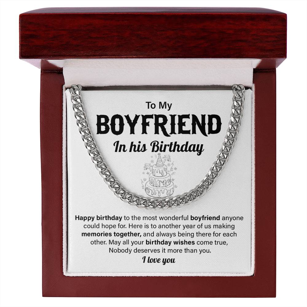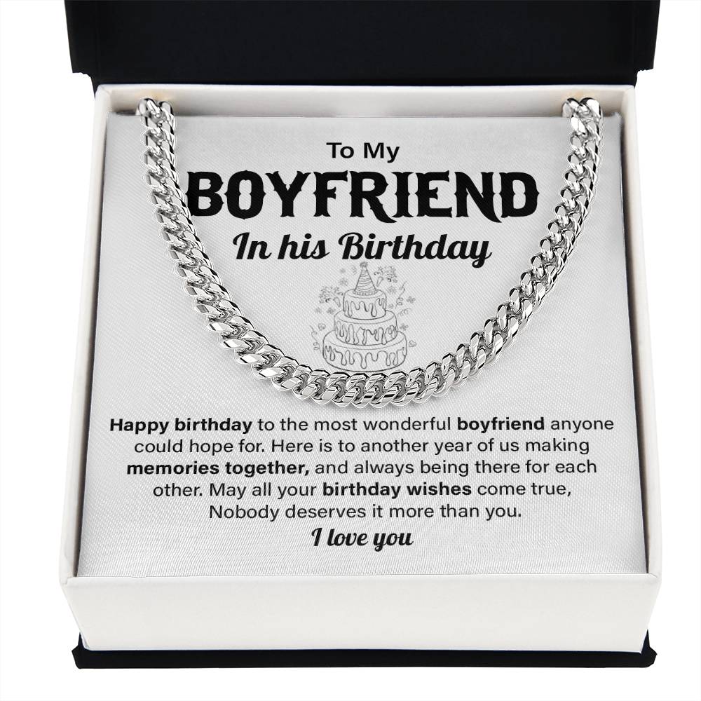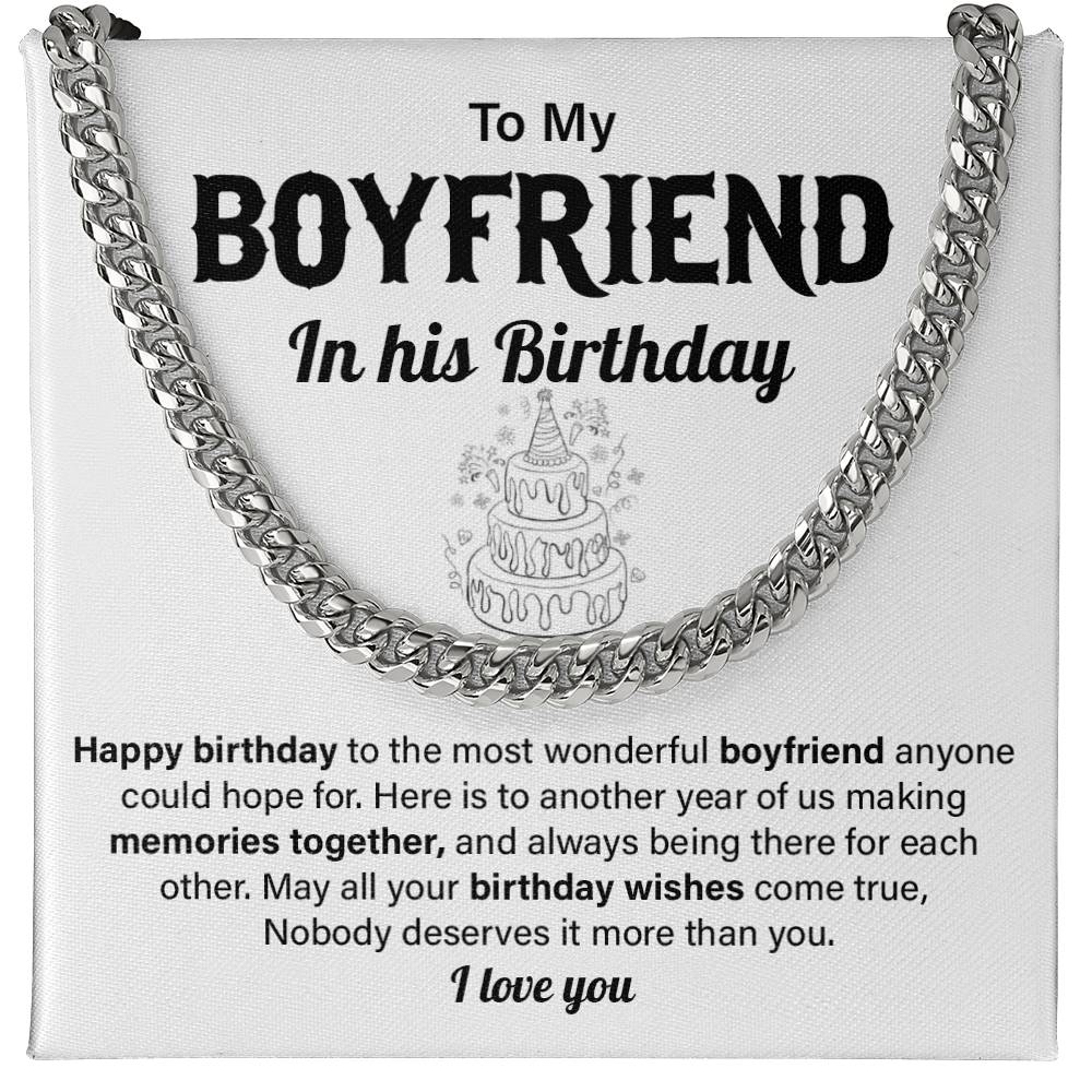 This is a special birthday present to your boyfriend, a daring Cuban chain necklace with a special birthday message card that will surprise your partner. This is a perfect present to girlfriends who want to give a present to boyfriend on his birthday as a gift given by girlfriend. It is ideal when it comes to long-distance relationships, romantic couples, and people who would like to honor him with a forever keepsake.