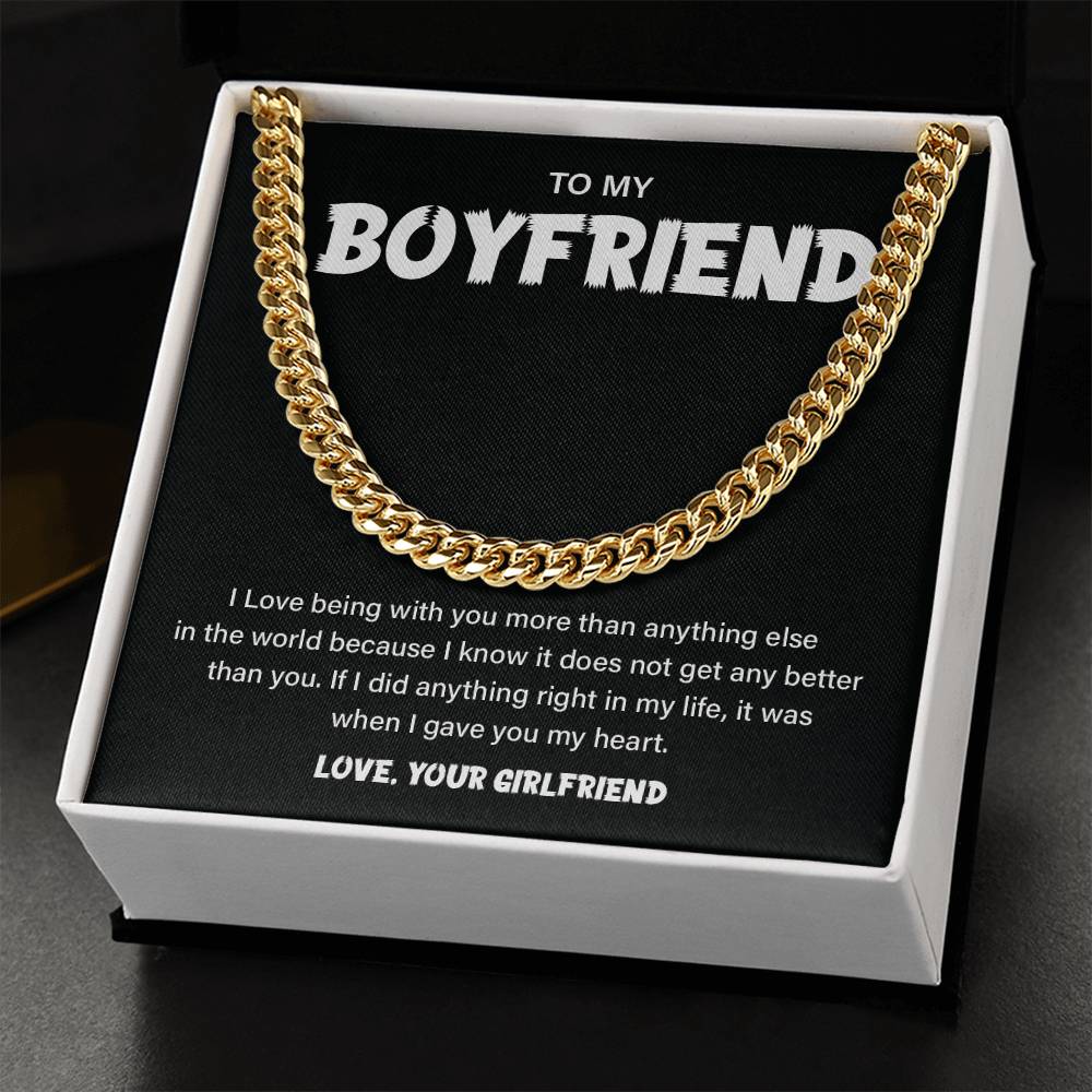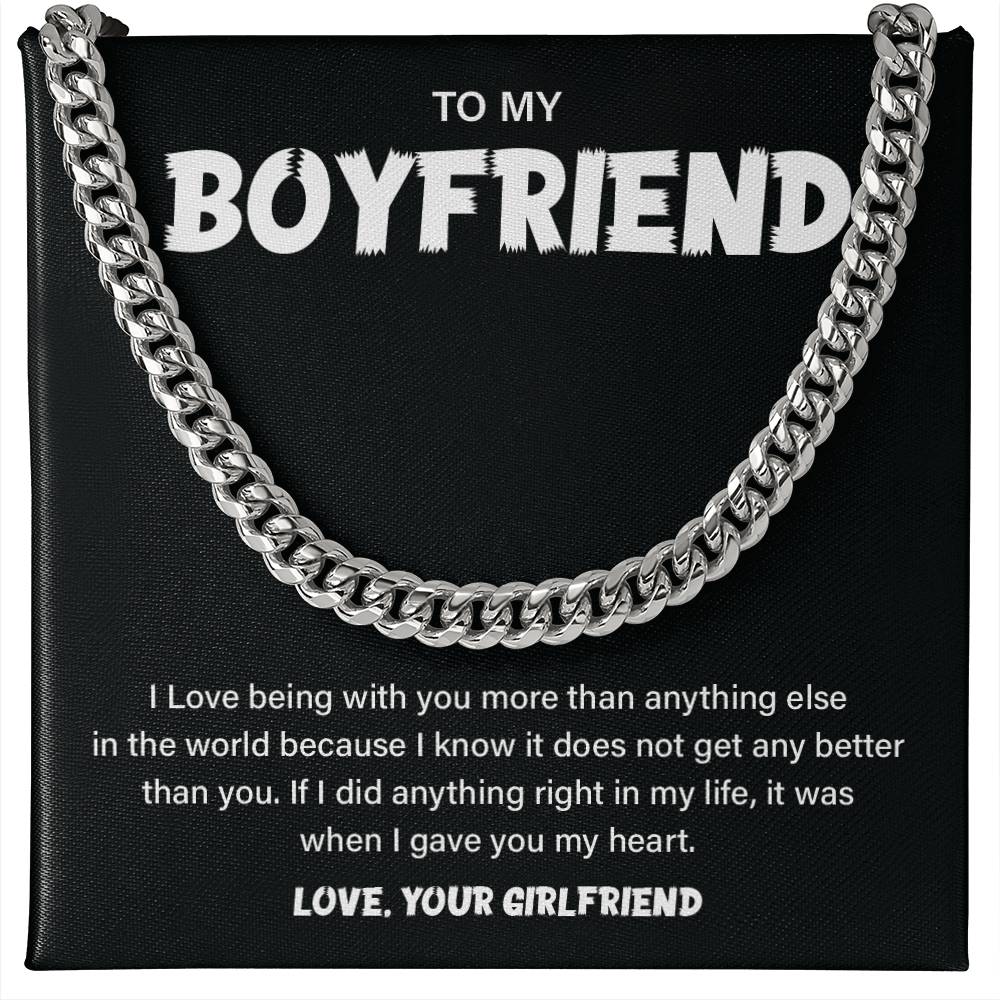 Be it your anniversary or just to remind your boyfriend how much you love him, this Cuban chain necklace with a love message card is the right gift. A moving gift that goes right to the heart--made by the man that you love the most.