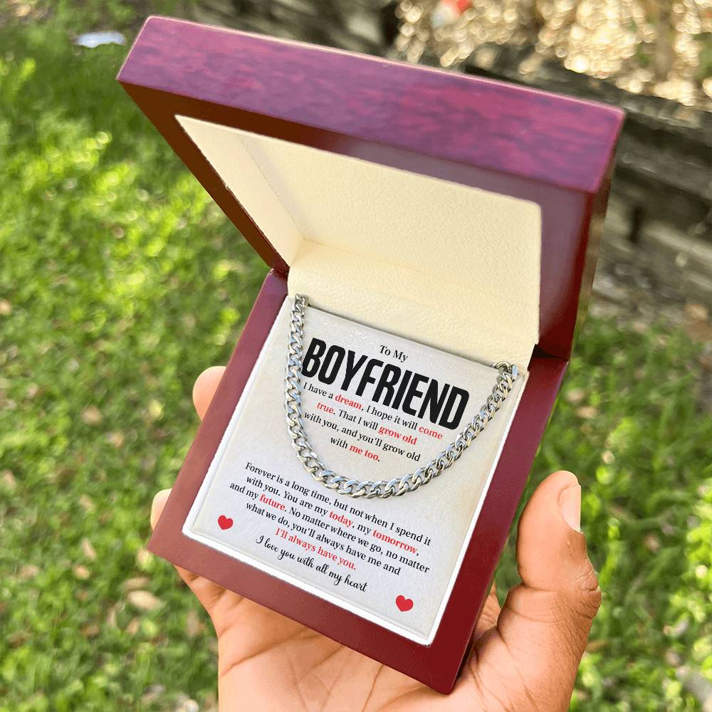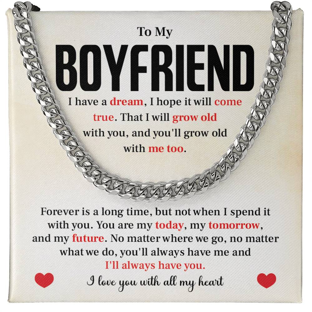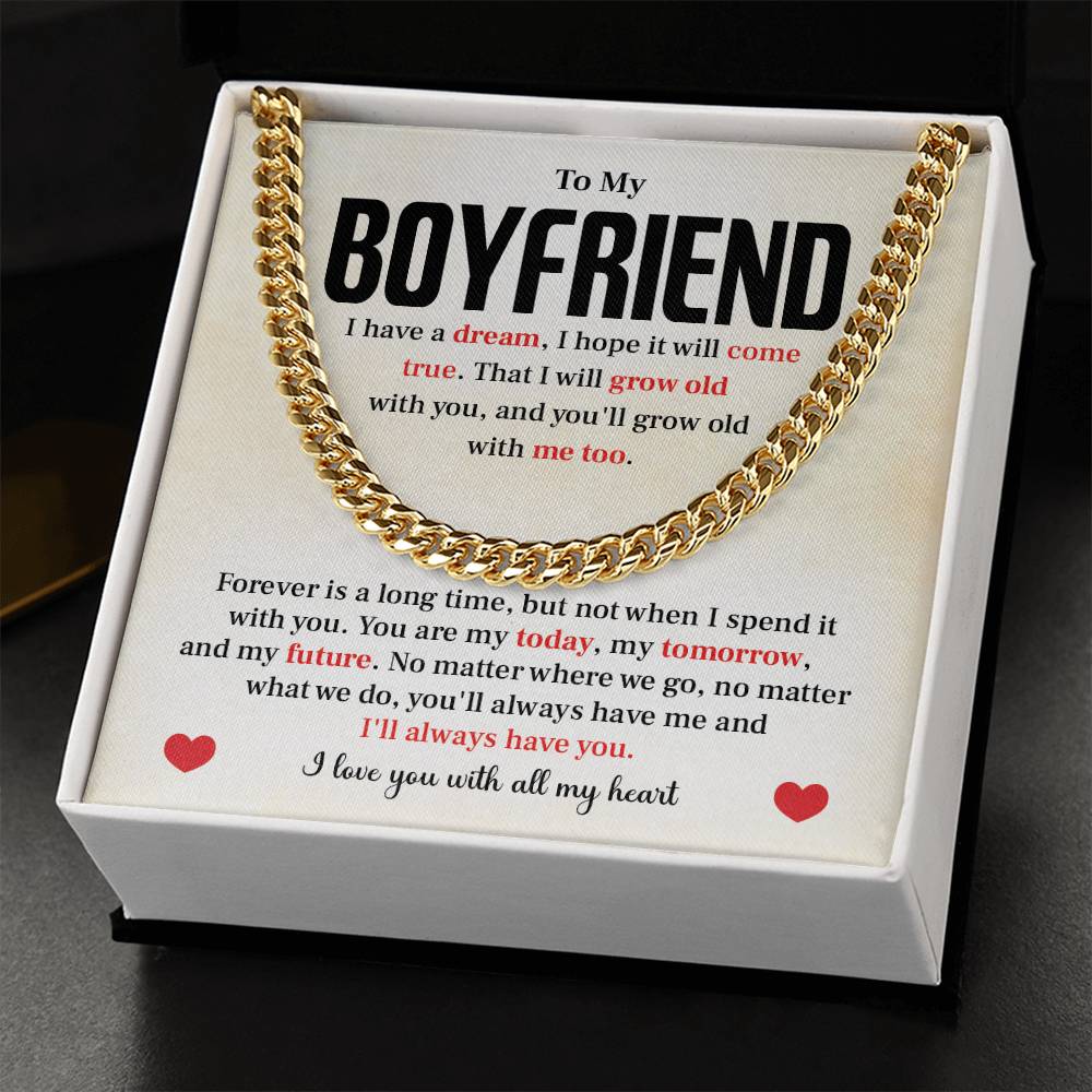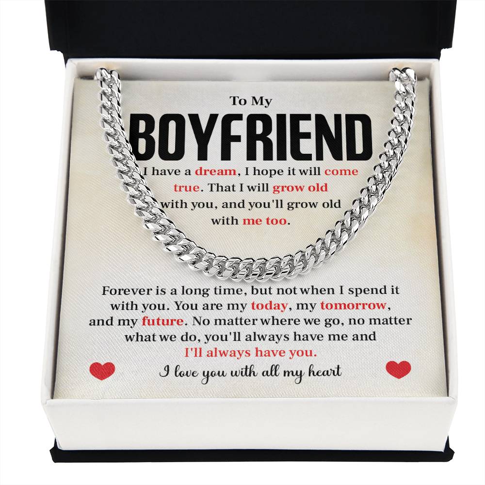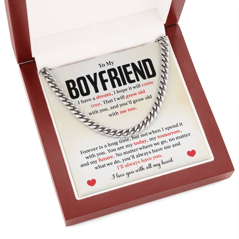 Are you searching to find a best-rated boyfriend gift idea? This is a fashionable and sentimental men necklace made of Cuban link chain as a romantic jewelry. It is a fashionable gift idea to give to the boyfriend on his birthday, on a special anniversary or a just because present. This boyfriend necklace by girlfriend is a fashionable yet emotional gift, presented in a high-quality gift box with a moving message card, which is an ideal surprise to your beloved one.