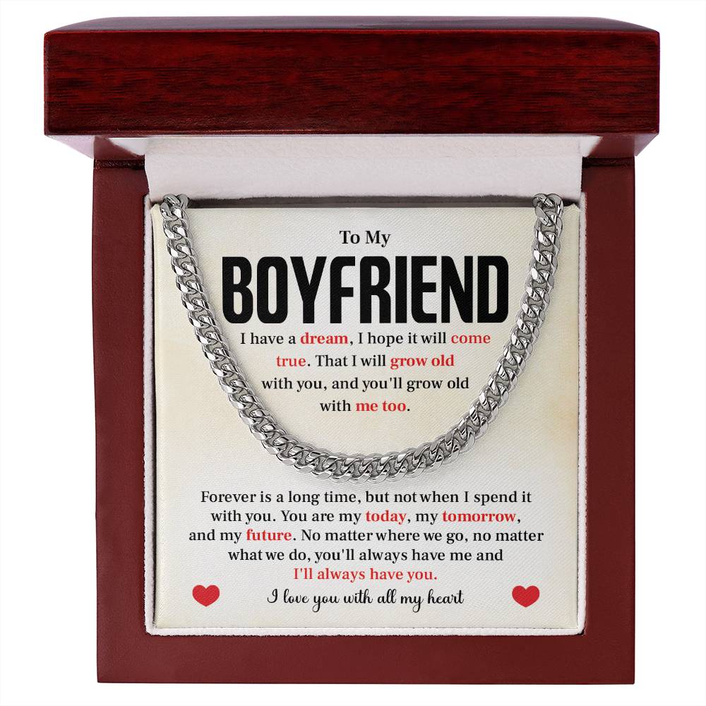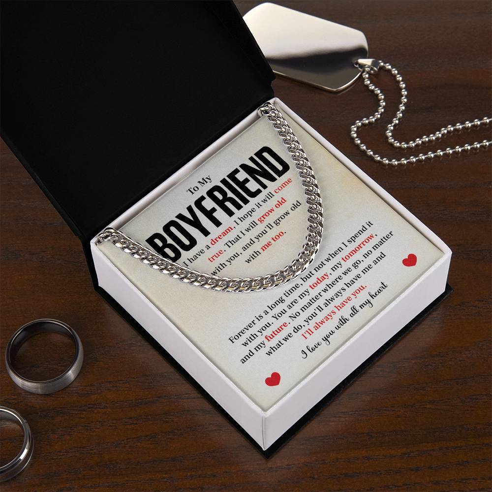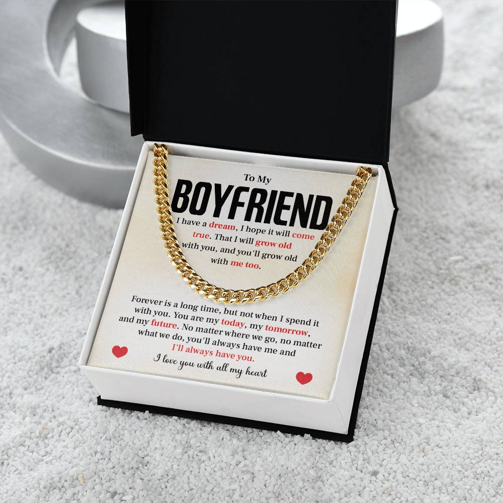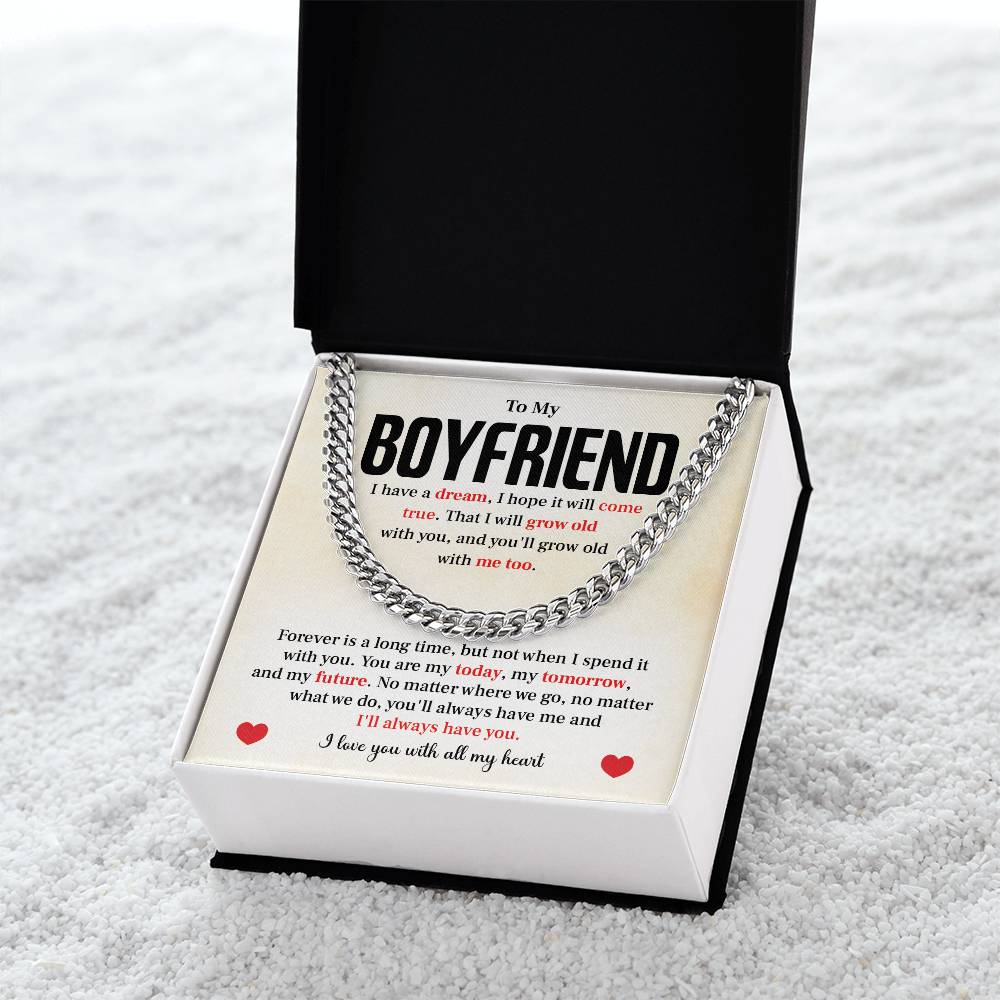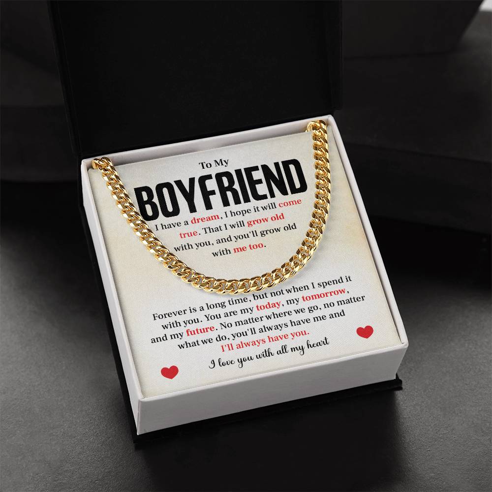 Are you searching to find a best-rated boyfriend gift idea? This is a fashionable and sentimental men necklace made of Cuban link chain as a romantic jewelry. It is a fashionable gift idea to give to the boyfriend on his birthday, on a special anniversary or a just because present. This boyfriend necklace by girlfriend is a fashionable yet emotional gift, presented in a high-quality gift box with a moving message card, which is an ideal surprise to your beloved one.