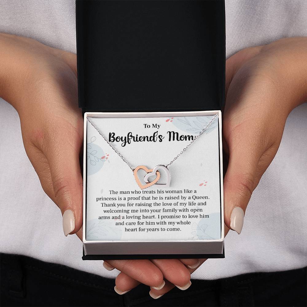 Want to find a sentimental gift of jewelry to your boyfriends mother? It is a thoughtful gift of girlfriend to future mother-in-law, a best-selling interlocking hearts necklace. This keepsake is an excellent gift to give on birthdays, Mother Day, or family gatherings, and it is a highly rated gift, which shows love, appreciation, and bonding.