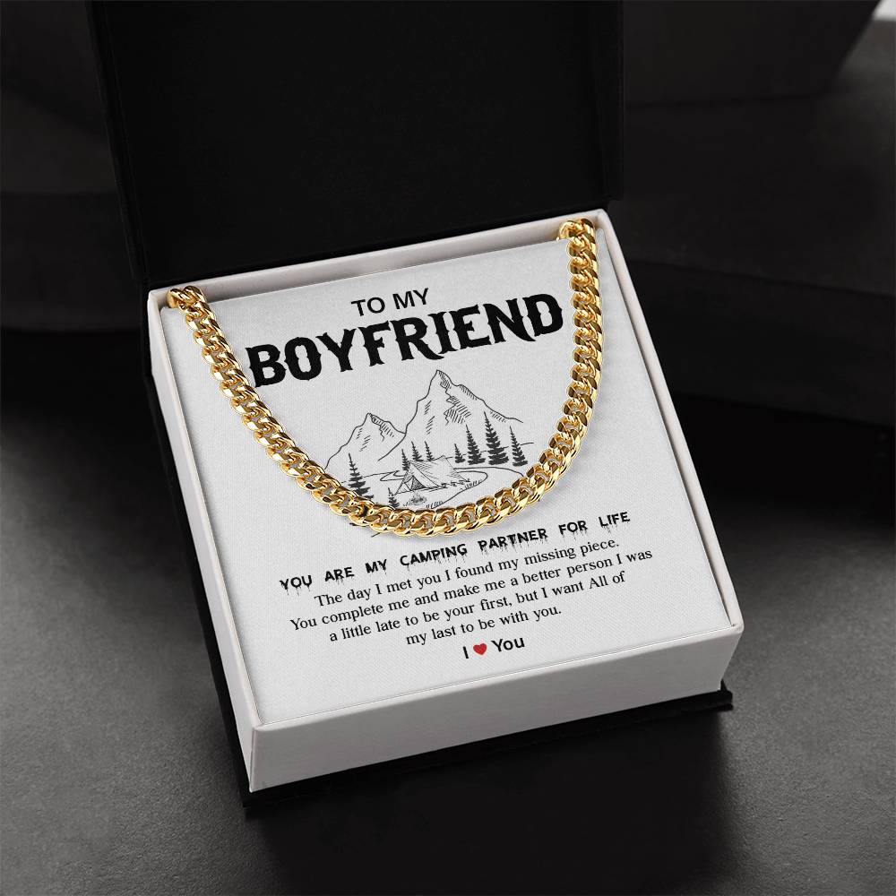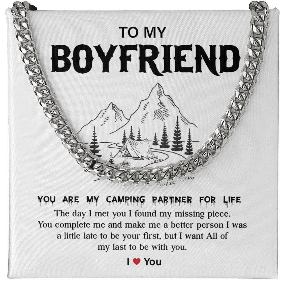 Share your passion of adventure and your boyfriend with this special Cuban chain necklace - a nice camping gift to him. This boyfriend necklace is ideal as a romantic gift to your loved one on their birthday, anniversary, or even on valentines day as it comes with a heartfelt message card that is perfect to suit couples who love hiking, traveling or the outdoors. He could be your hiking partner or tent mate, but make him know that he is your adventure partner forever.