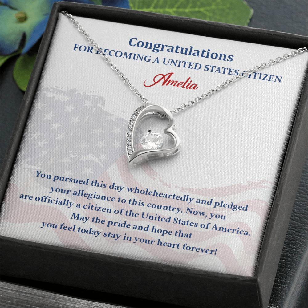 Celebrate her amazing feat of becoming a U.S. citizen with this beautiful necklace and a touching message card. This keepsake has a gently worn American flag and a message that is full of pride and patriotism to celebrate her journey and her future.