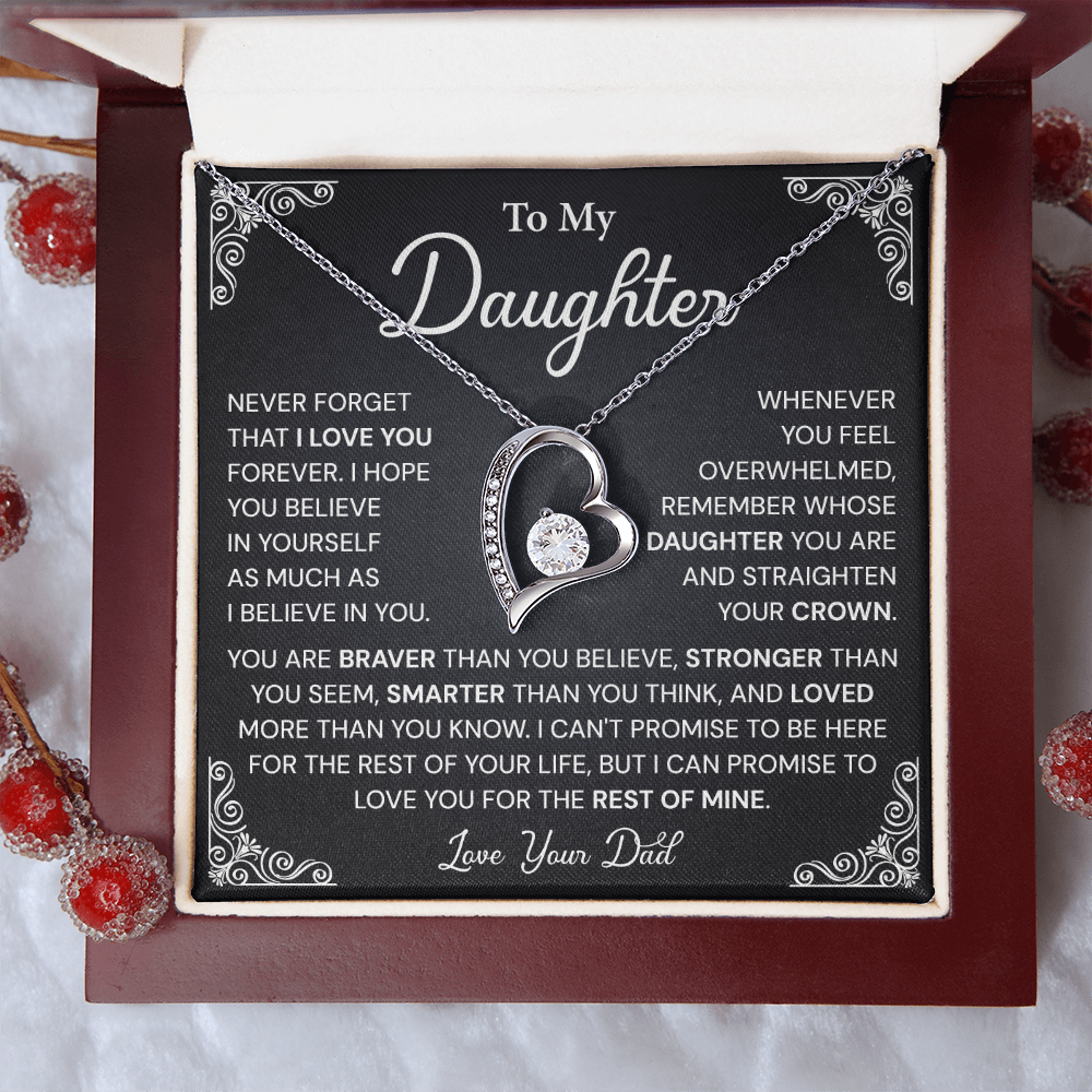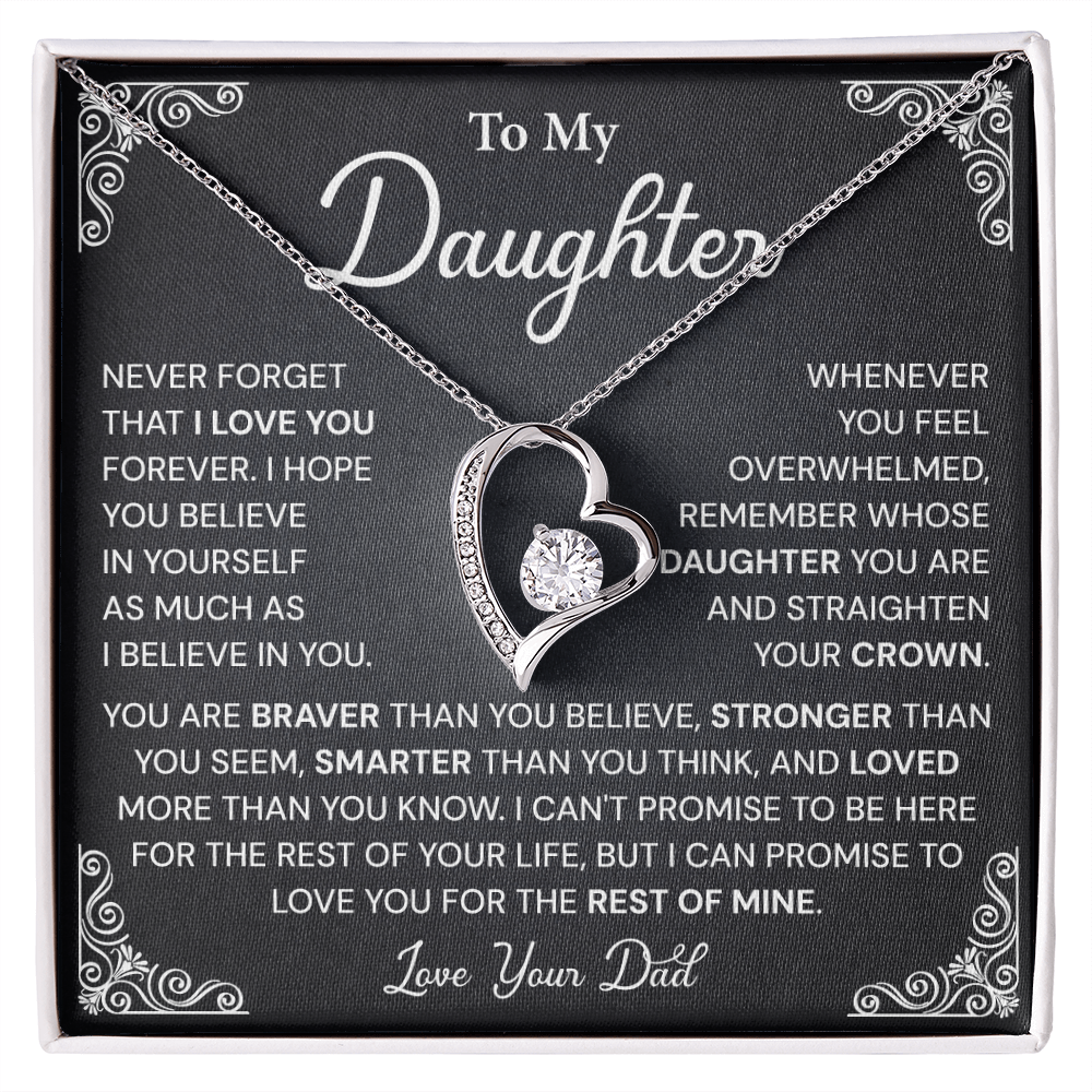 The perfect way to express your pride is through this everlasting treasure. The heart pendant necklace accompanies a meaningful note from dad which expresses your deep love and appreciation for her strength and value.