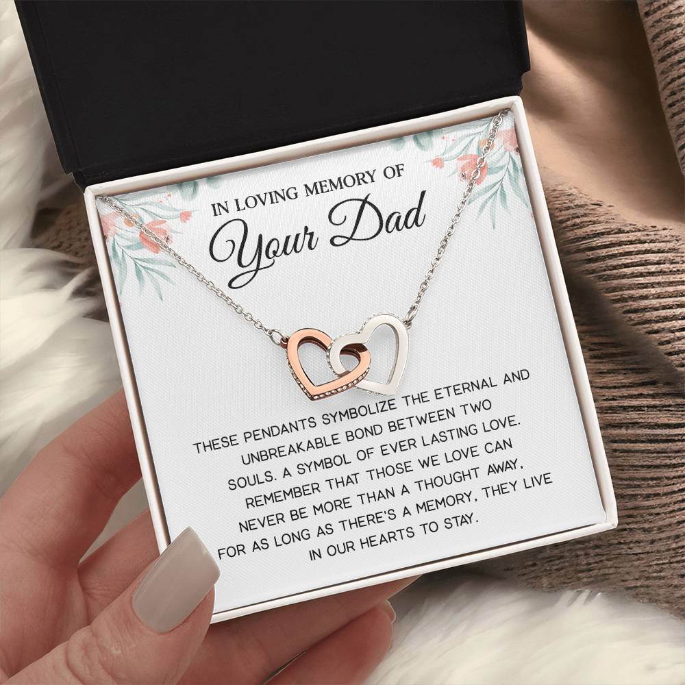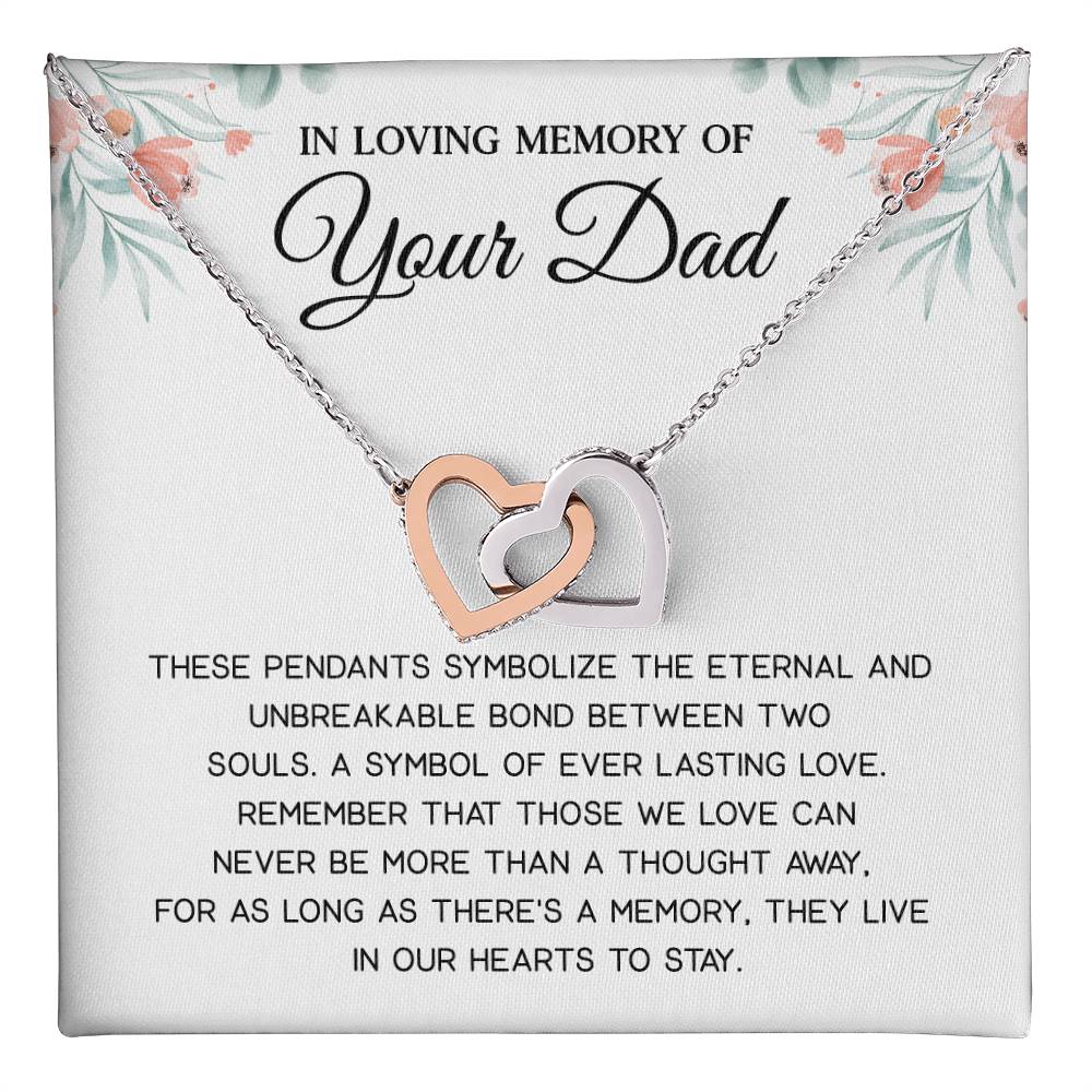 Remember the immortal love of a daughter or son and his deceased father with this heartwarming memorial necklace. This tribute gift consists of two intertwined hearts and a heartfelt sympathy card that will comfort and remind the grieving person about a lost dad.