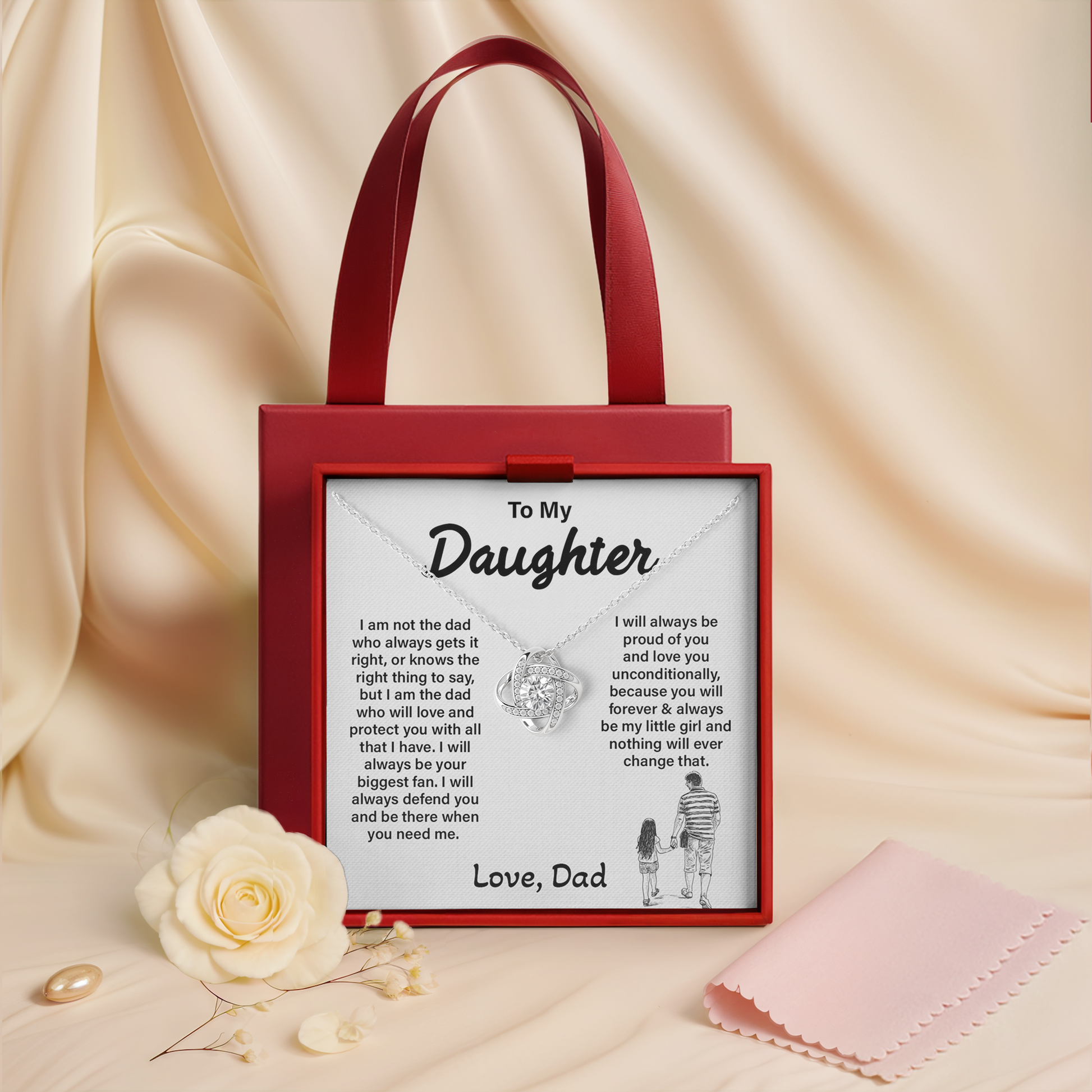 Give your daughter a present that expresses what a father's heart frequently feels but seldom expresses. This exquisite Love Knot Necklace represents protection, unending love, and the unbreakable bond between a father and his daughter. Ideal for all of her milestones, including birthdays and graduations.