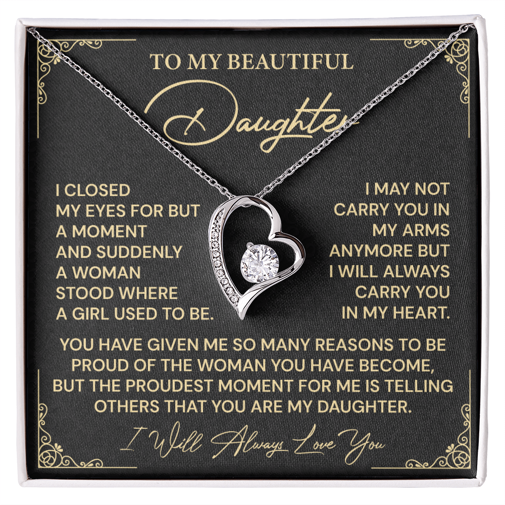Present your daughter with this meaningful jewelry piece to honor her transformation into a woman. The heart pendant comes with an emotional keepsake message which makes it an eternal treasure she will always treasure.