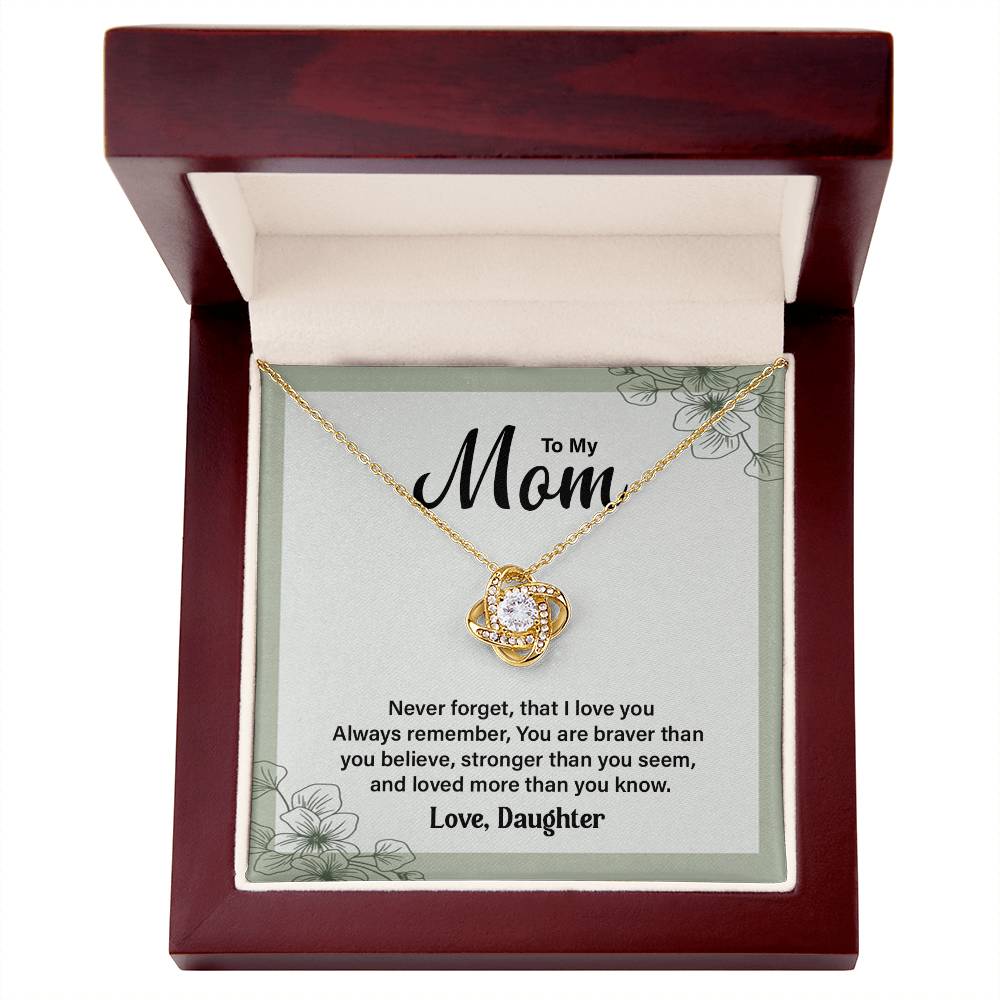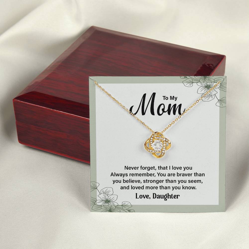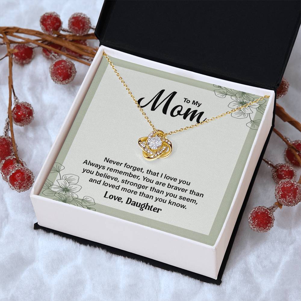 This beautiful necklace with a love knot is a touching present of a daughter to her mother, who is so strong, loving and beautiful. It can be a Mother Day, birthday or just to say I love you, this beautiful piece of jewelry with an inspiring message card and gift box will make her heart melt.