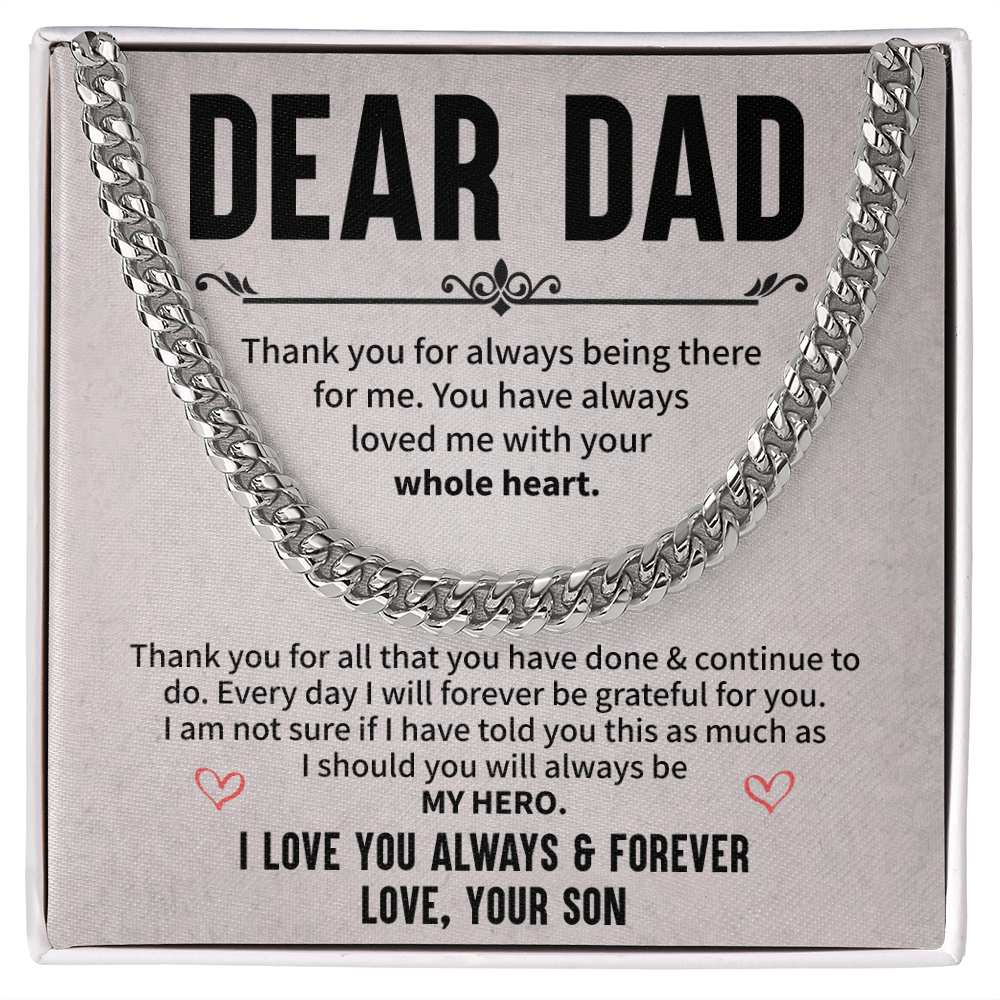 Your father will realize his worth through this powerful Cuban Chain Necklace that you have created. The design represents strength and respect through a classic piece which includes a meaningful message card expressing lifelong appreciation.