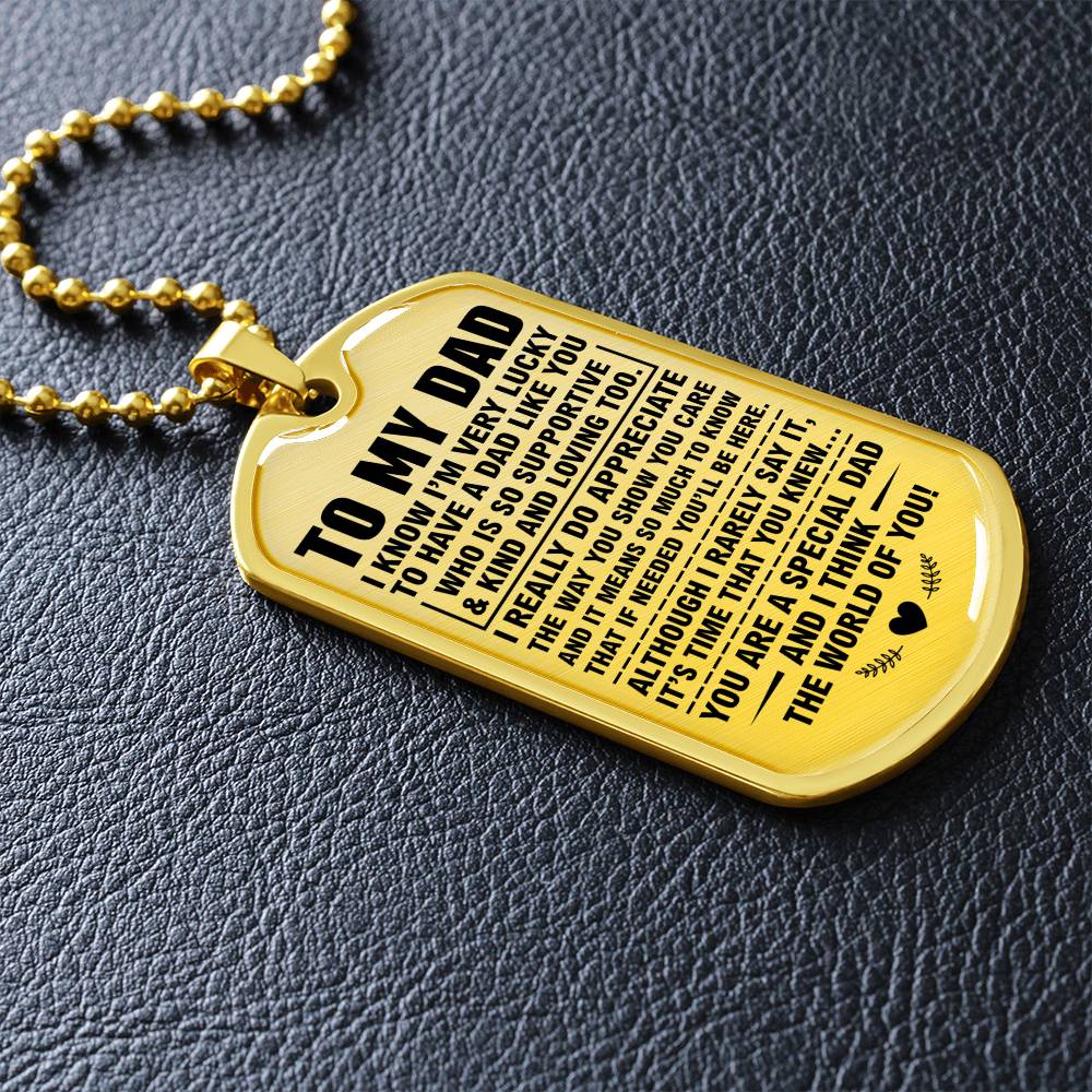 Surprise your dad with a heartfelt reminder of how much he means to you. This durable stainless steel dog tag necklace is the perfect gift for a supportive and loving father from his son or daughter.
