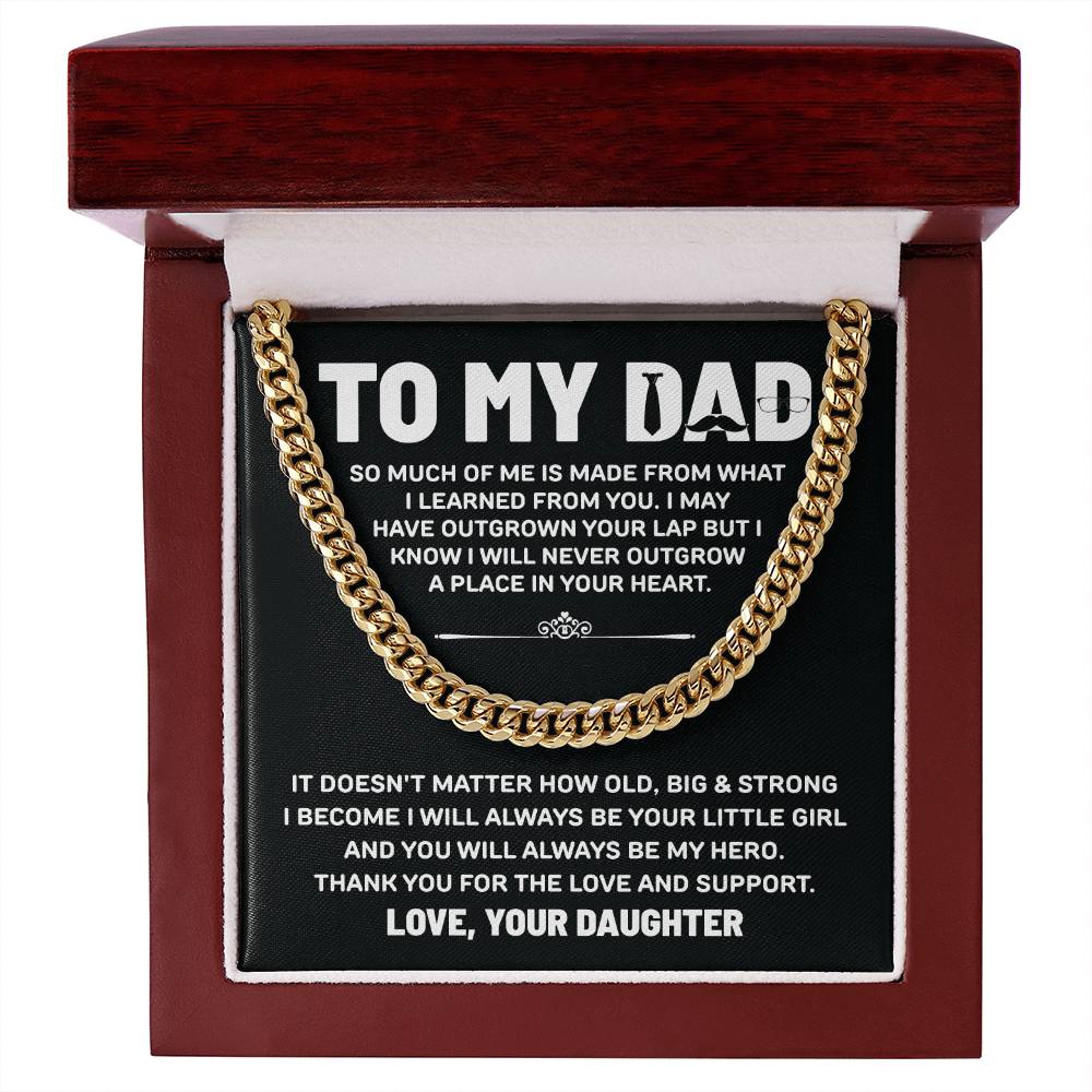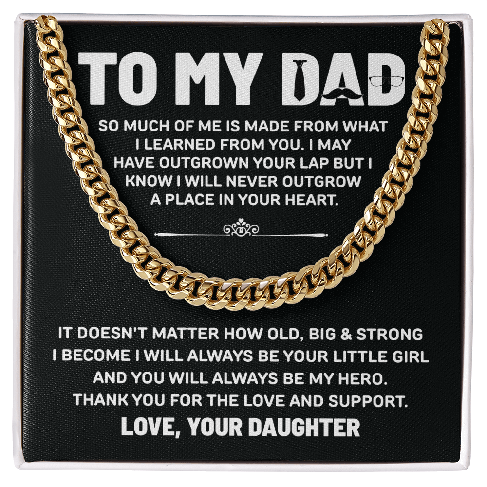 Show your appreciation for your father's infinite support through this powerful Cuban Link Chain design. The sentimental card accompanies the keepsake to make it a strong reminder of the unbreakable father-daughter bond.