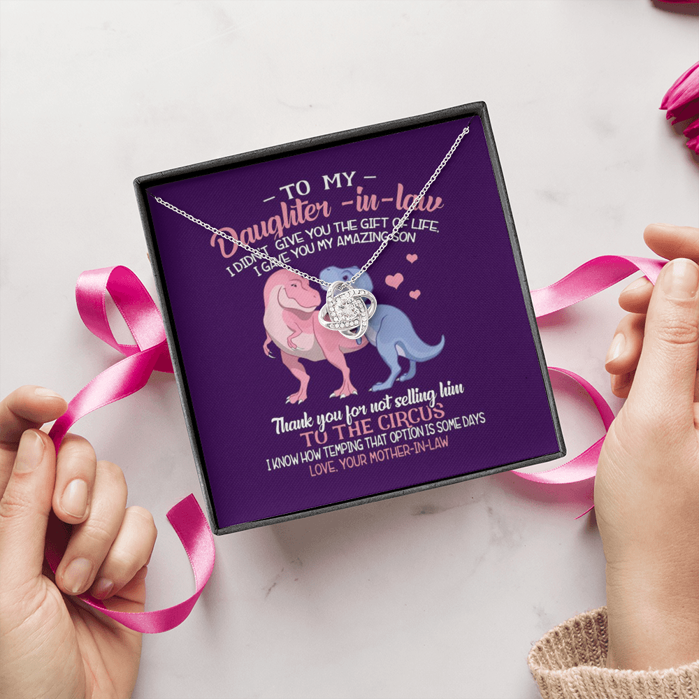 Make your daughter-in-law laugh and feel loved with this funny and heartfelt necklace gift. Featuring a charming dinosaur-themed message card and a sparkling pendant, this keepsake is perfect for birthdays, holidays, or just because.