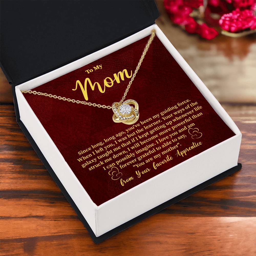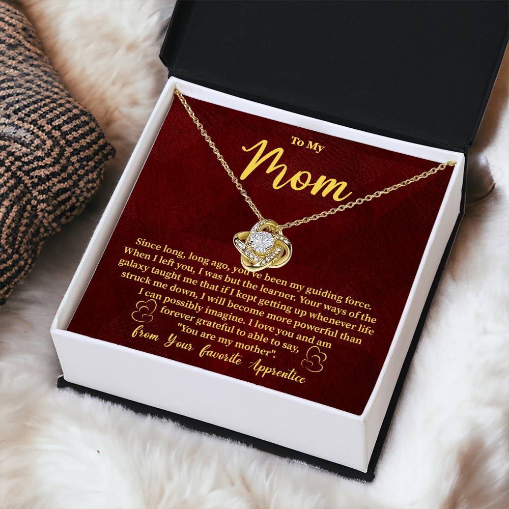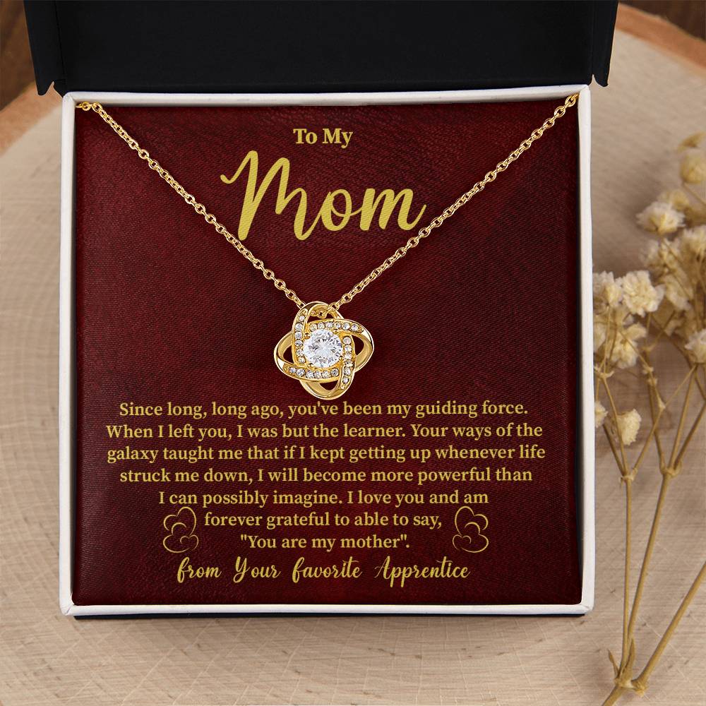 This is a special and humorous necklace gift to your guiding force. Based on the galaxy and your transformation as a learner to a powerful being, this necklace is adorned with a love knot pendant and message card that is filled with geeky jokes and heartfelt thanks. Ideal as a birthday present, Mother Day or whenever you feel like telling your mom that she is the real master.