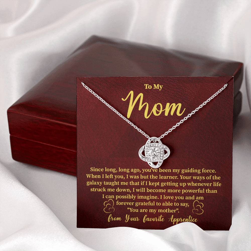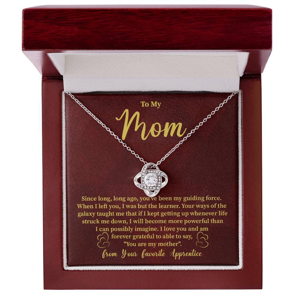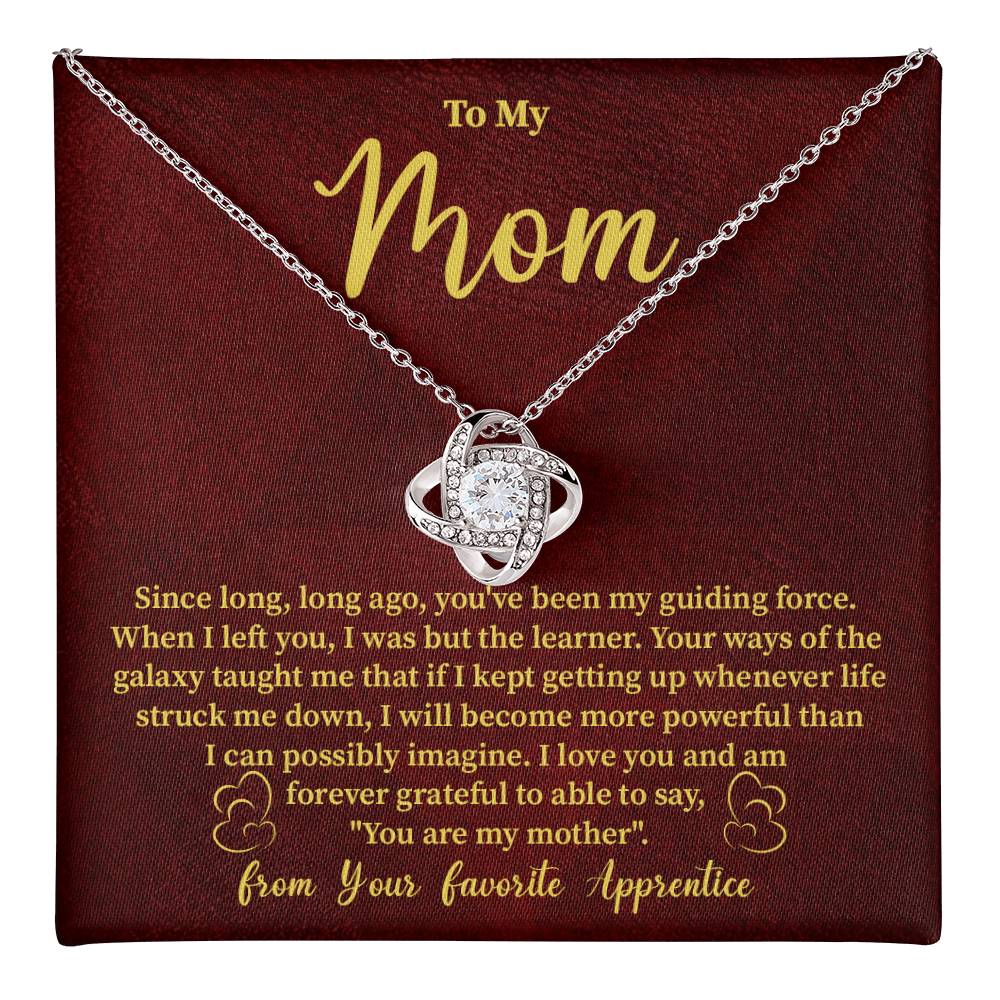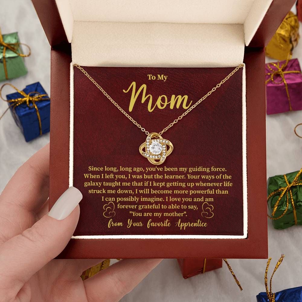This is a special and humorous necklace gift to your guiding force. Based on the galaxy and your transformation as a learner to a powerful being, this necklace is adorned with a love knot pendant and message card that is filled with geeky jokes and heartfelt thanks. Ideal as a birthday present, Mother Day or whenever you feel like telling your mom that she is the real master.