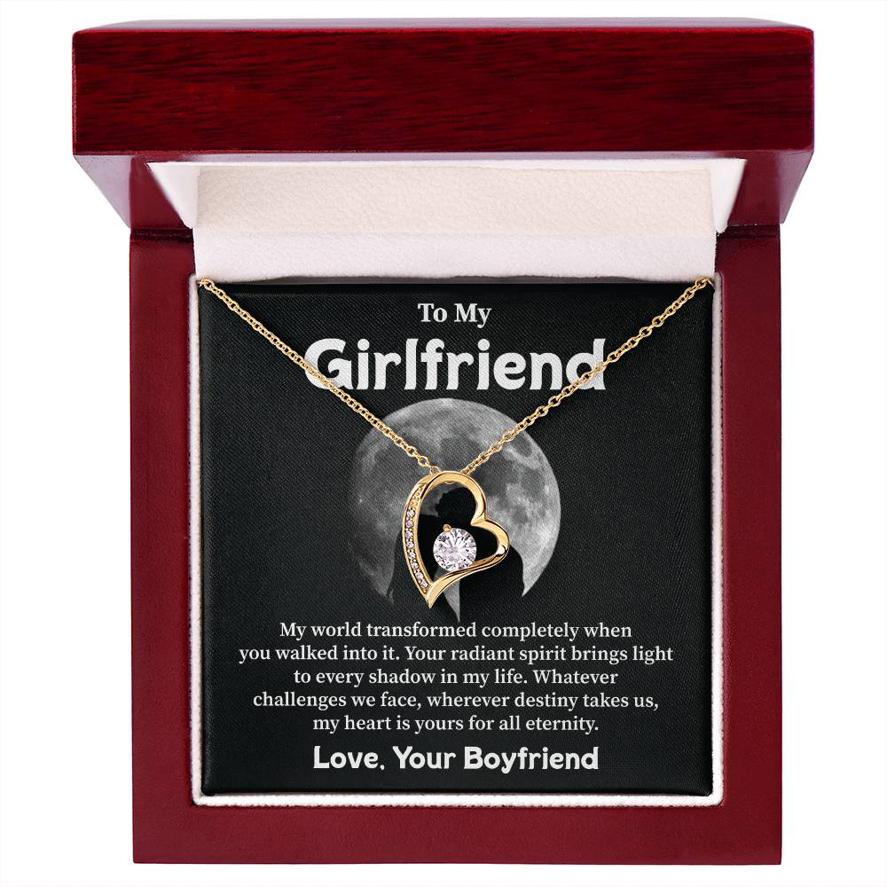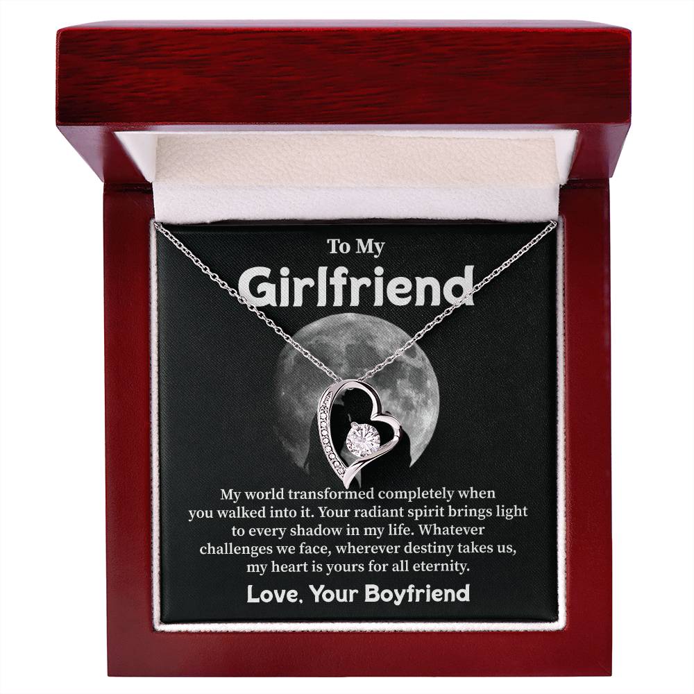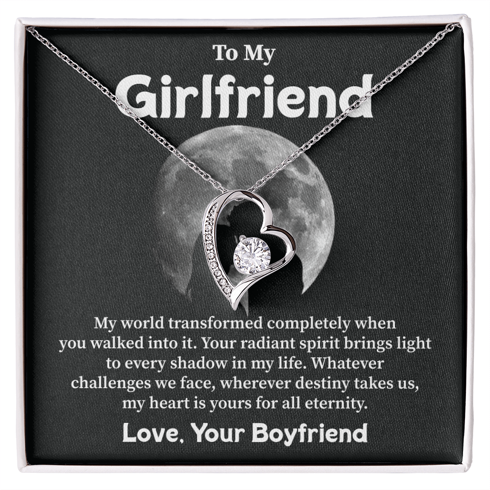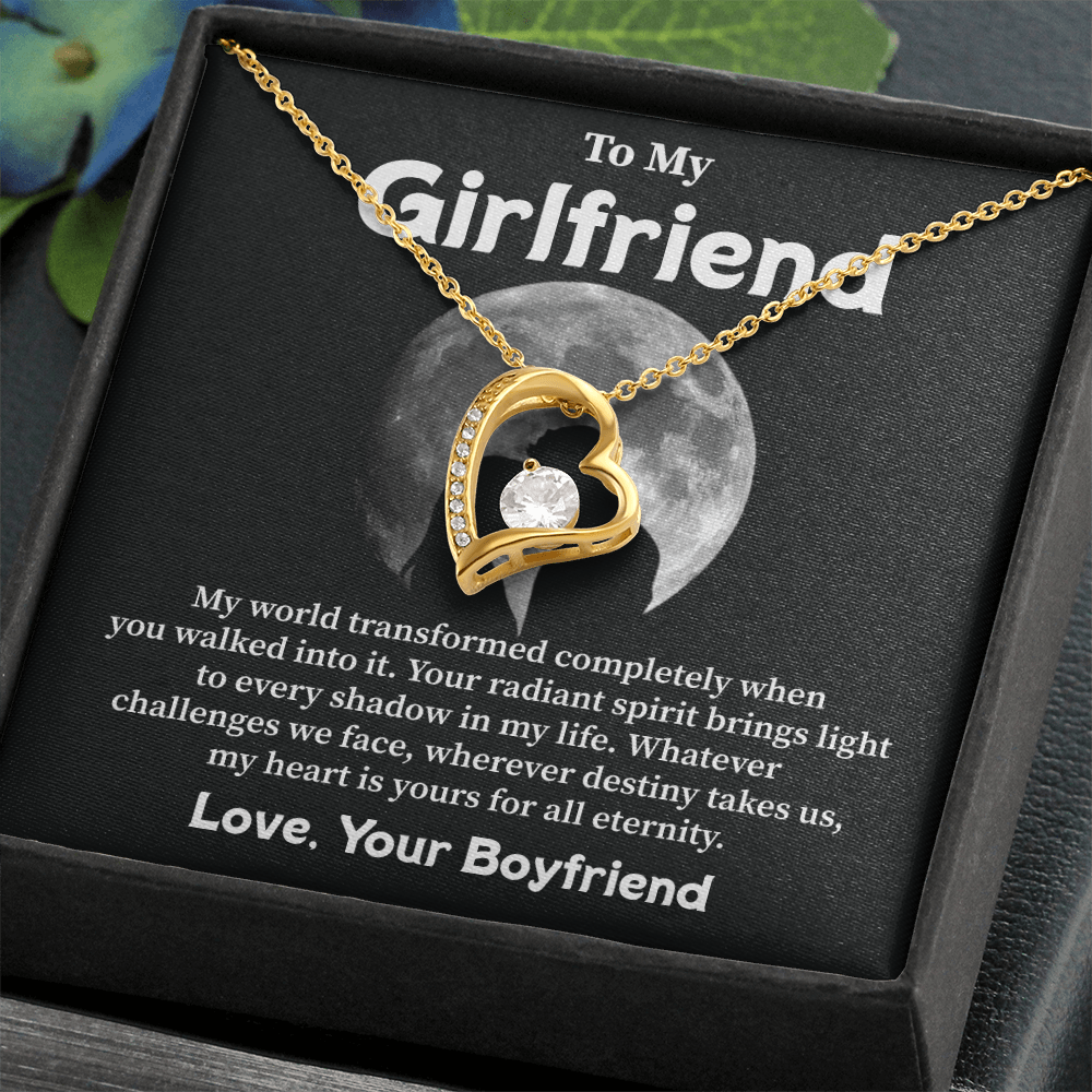 Your love shines as her guiding light through all life brings her way. Tell her this truth. A heart-shaped necklace along with its moonlit message card creates the perfect means to say "you are my forever." A meaningful gift from a devoted boyfriend to his one and only.