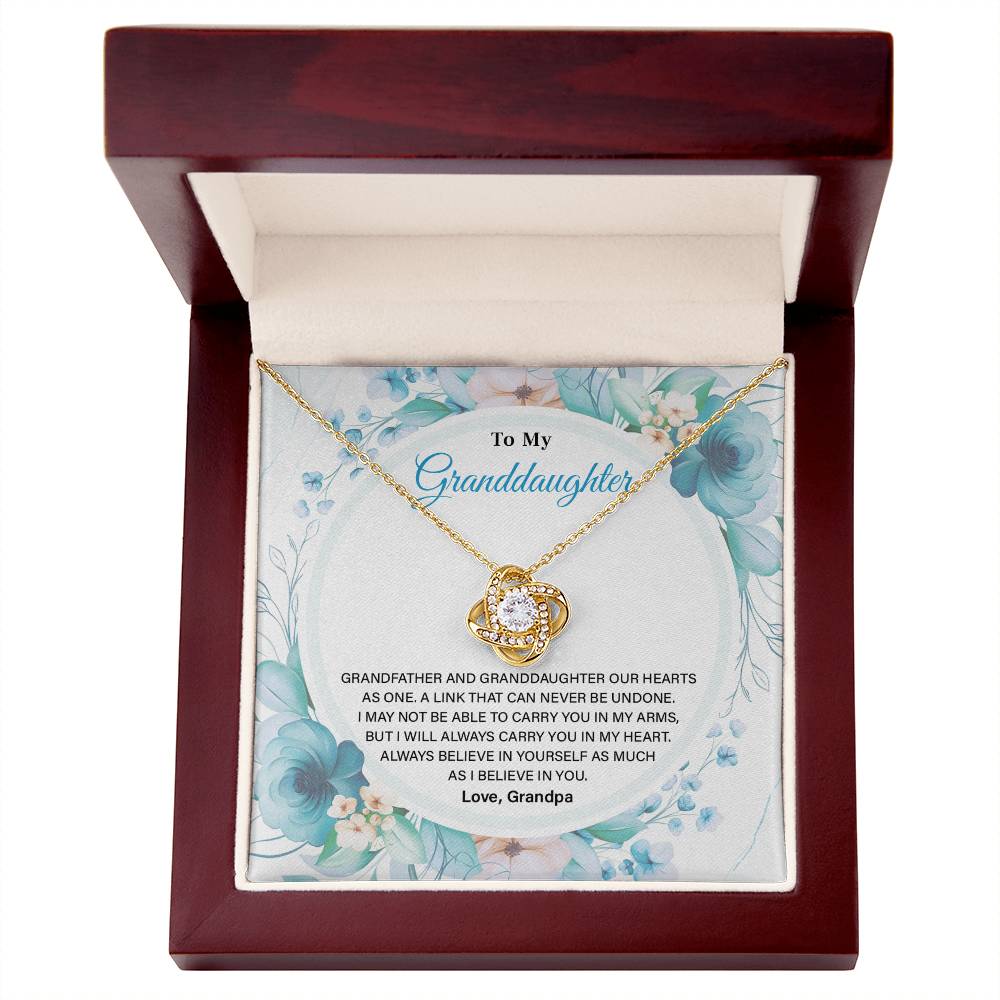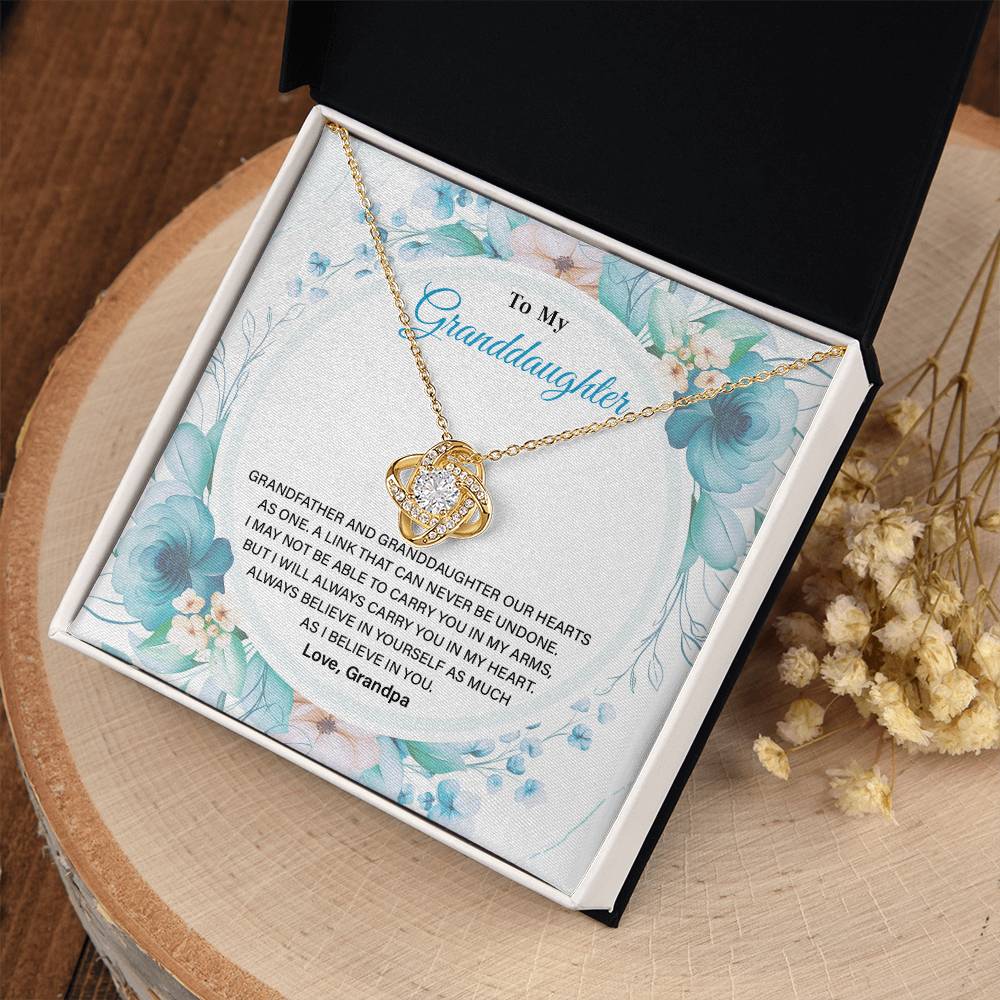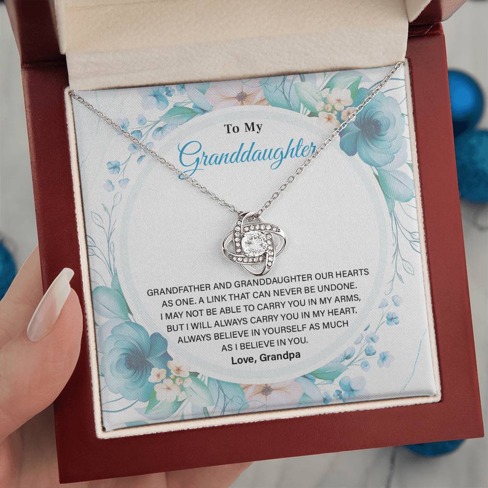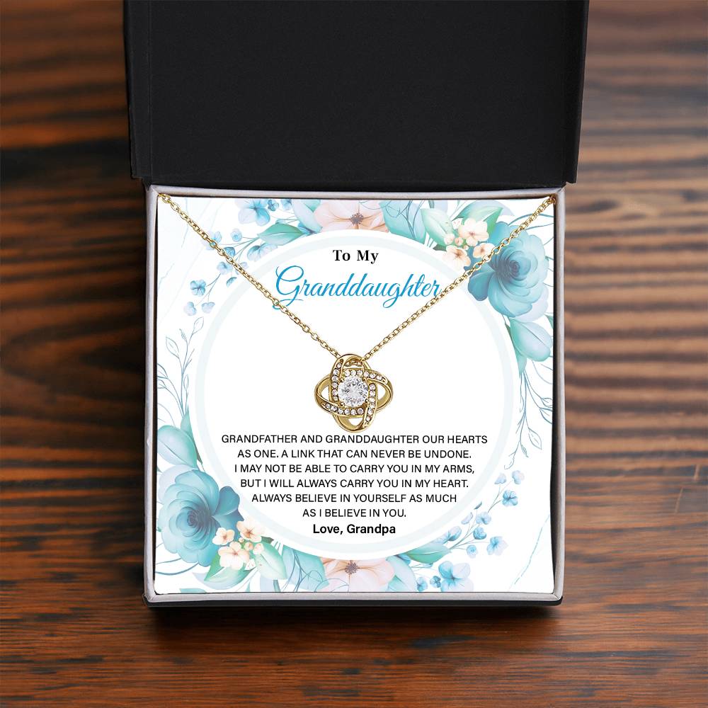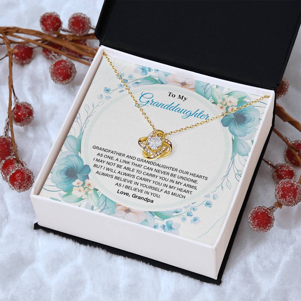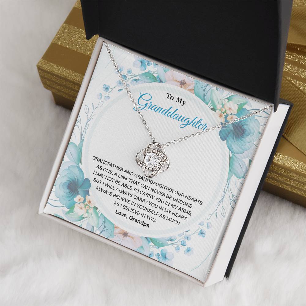 This beautiful love knot necklace is a way of celebrating the unbreakable relationship between a grandfather and his granddaughter. This jewelry gift is ideal as a birthday present, a Christmas gift, or any other heart warming event, and the message card that comes with it will give the granddaughter the feeling of warmth and support she needs.
