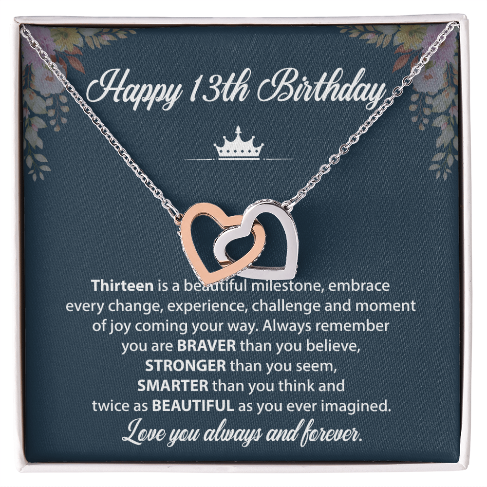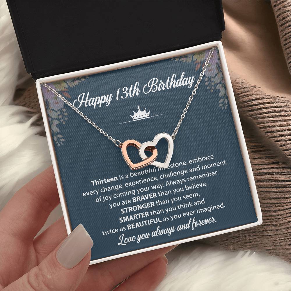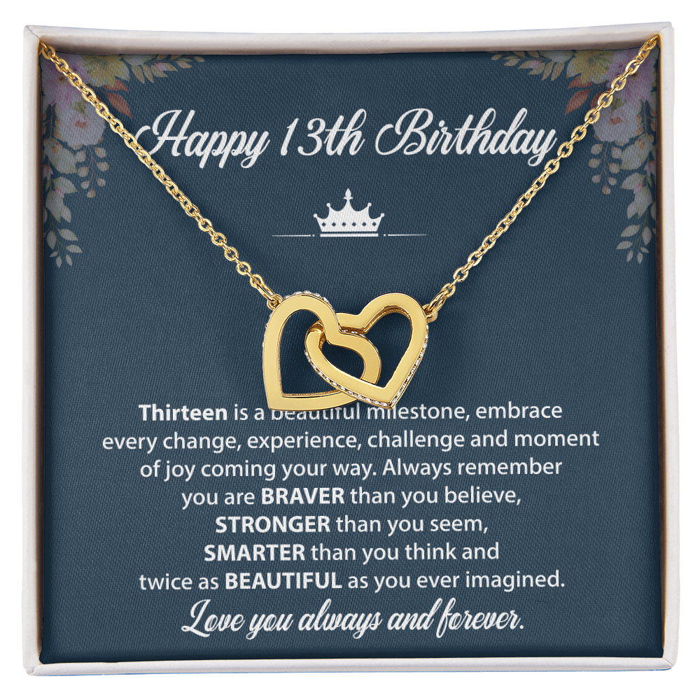 Turning thirteen is an important milestone – and it deserves an event with meaning and staying power. This beautiful lock of linked hearts necklace holds more meaning to it – it is an encouragement, it is a growth, it is an unending love. A warm birthday wish on the necklace tells her how special and capable she is as she enters her teenage life.