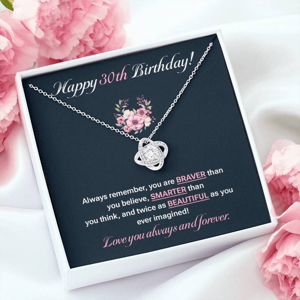 Give her a birthday present that will be special for her and last a lifetime. A lovely 30th birthday necklace with a heartfelt love knot pendant and a message card is the perfect gift for your daughter, niece, best friend or girlfriend.