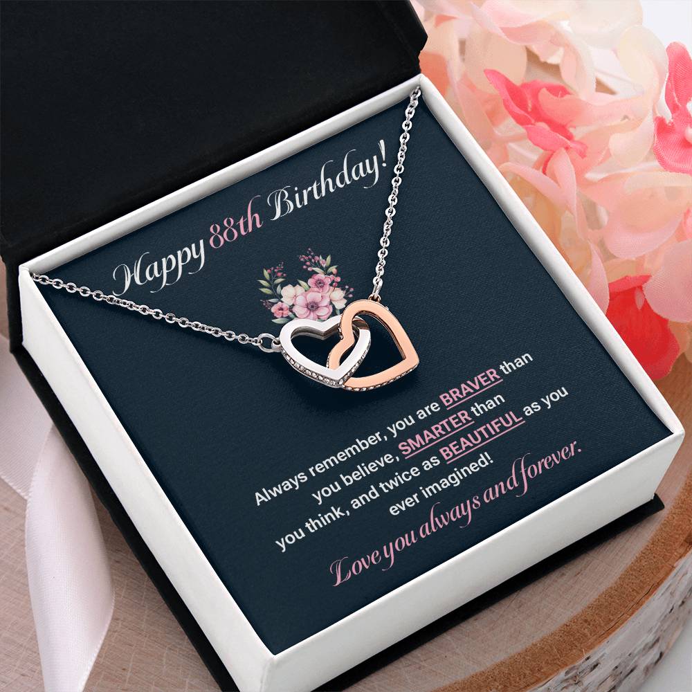 Mark a special birthday in style and affection. The 88th birthday interlocking hearts necklace is an eternal present that can be given to mothers, grandmothers, or any other valuable woman who needs to feel special and beautiful.