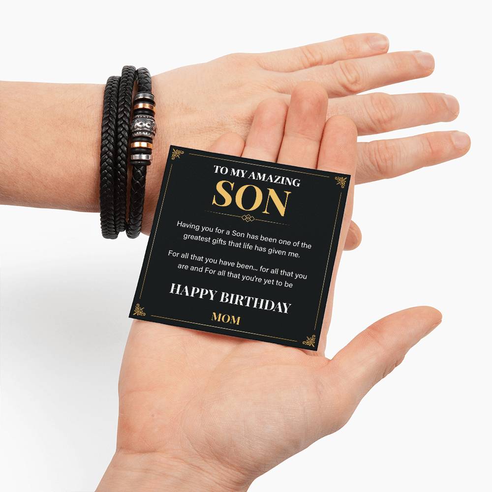 Give your son a meaningful birthday gift in a stylish way on his special day. This fine braided leather bracelet with gold-tone beads and engraved clasp is combined with a decadent birthday message card--a great way to celebrate him.