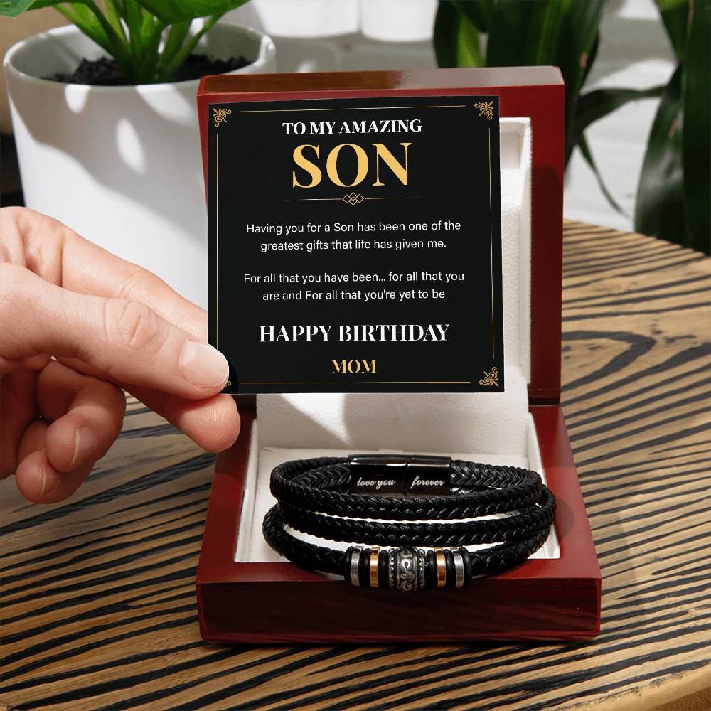 Present him with a birthday gift that is stylish and sentimental. Whenever he will be wearing this bracelet, he will be reminded about the love and pride of his Mom- and his birthday will be unforgettable.