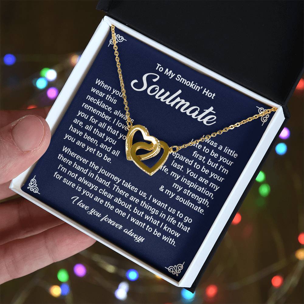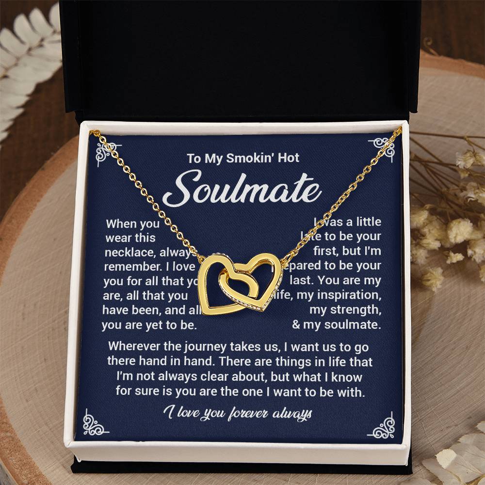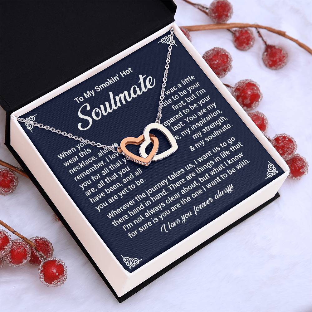 Give a love that lasts the test of time with this interlocking hearts necklace soulmate. This beautiful necklace is made to women who appreciate strong emotional connections, a touching message card and a background of pink color with so much warmth and love. It is a great anniversary present, birthday surprise, or a romantic necklace on Valentine day to her.