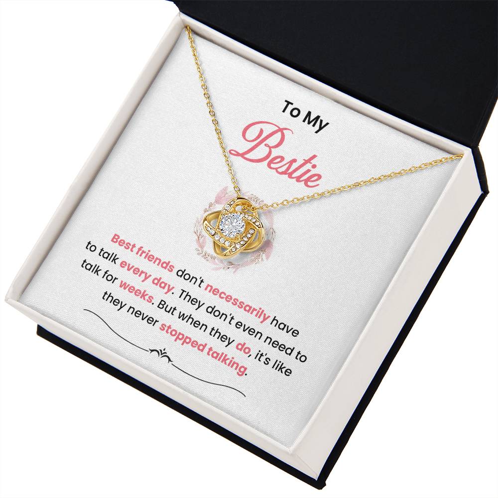 This necklace with a love knot will work as a memorable gift to someone dear to you. With an emotive quote card it will make an ideal gift to remind the friends they are not apart even after time changes. Best friends ought to have it as a birthday present, on the holidays or just because.