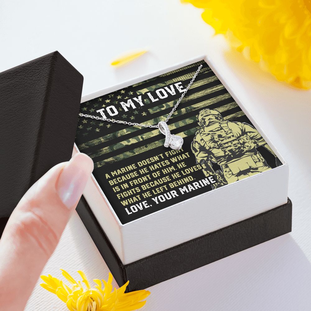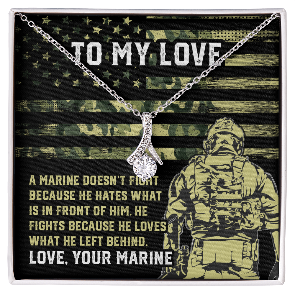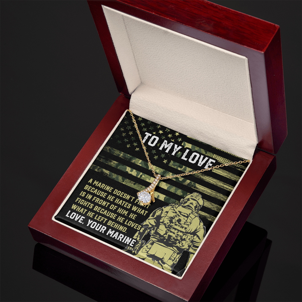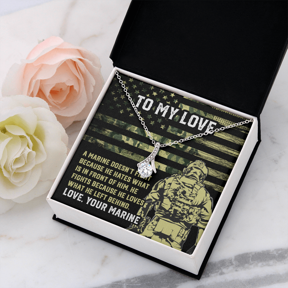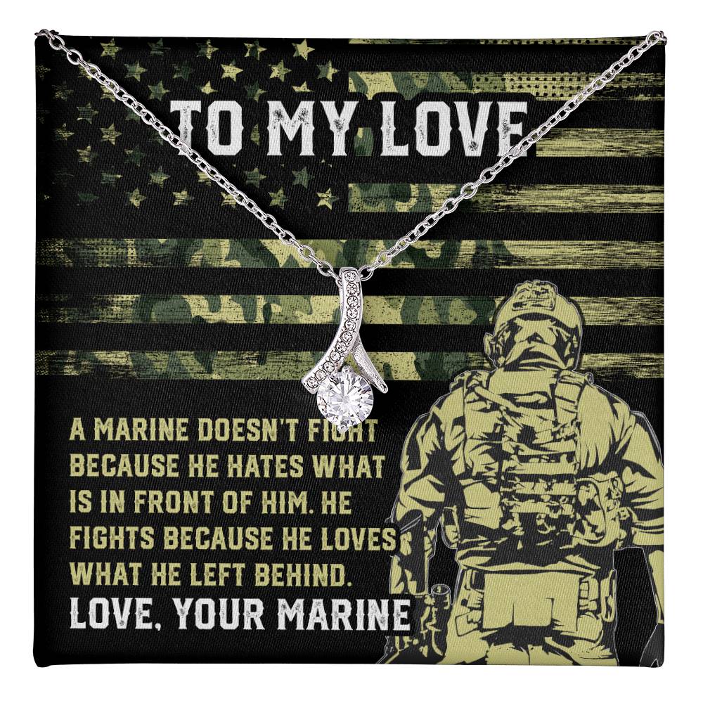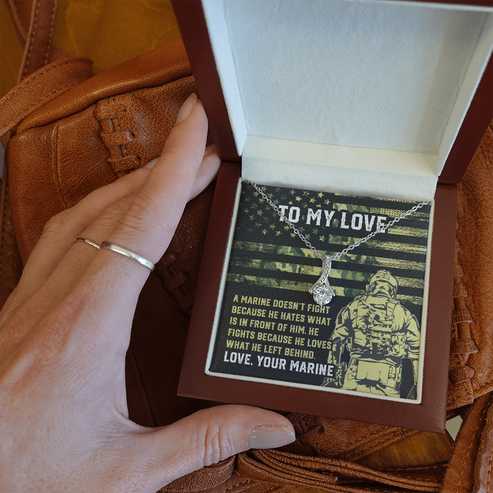 Show the love between a Marine and their partner with this powerful and emotional necklace. With an impressive pendant and a patriotic message, this gift is a dedication to love, sacrifice, and unswerving devotion.