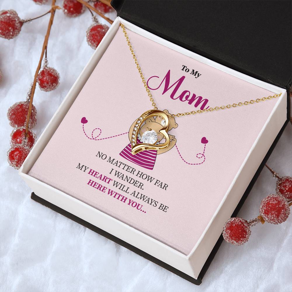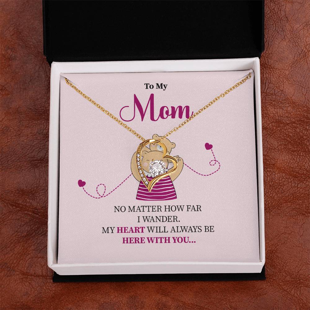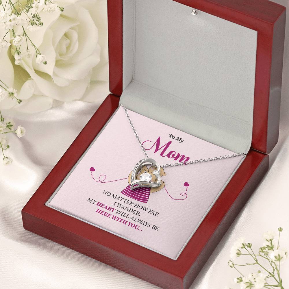 Present your mom with a gift that she will never forget. This beautiful necklace and its heartwarming message will help her to know that no matter where life will bring you, your hearts will always be tied together. Your piece is lovingly packaged in a complimentary soft touch box for easy gifting. Elevate your presentation by upgrading to the mahogany style luxury box, which features a brilliant LED spotlight.