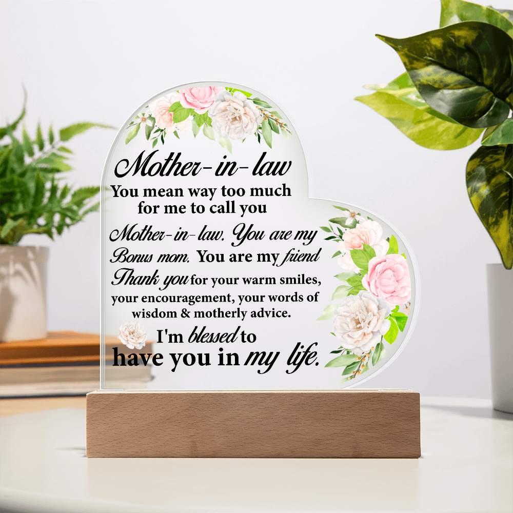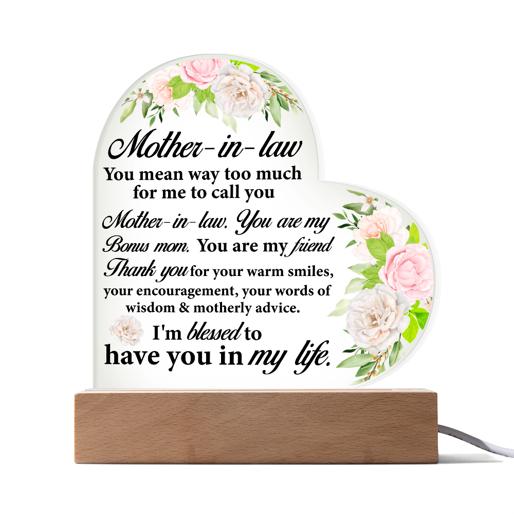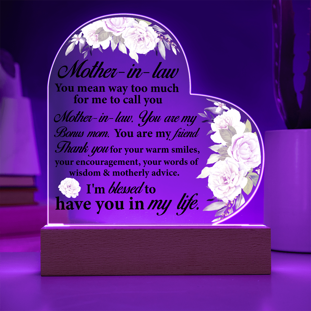 Celebrate the incredible bond you share with your mother-in-law with this elegant acrylic heart plaque. A meaningful gift to express your gratitude and love on Mother's Day, birthdays, weddings, or any special occasion.