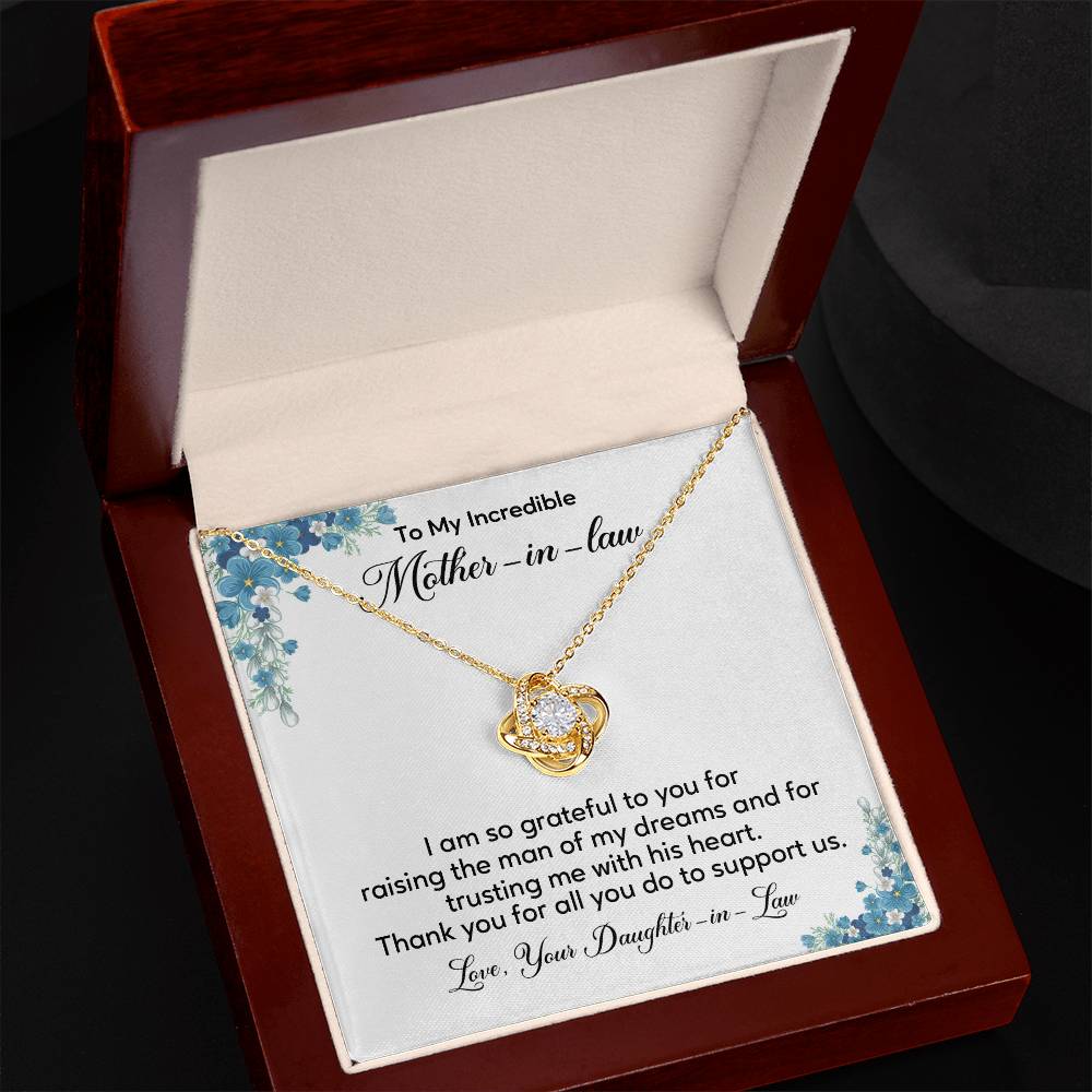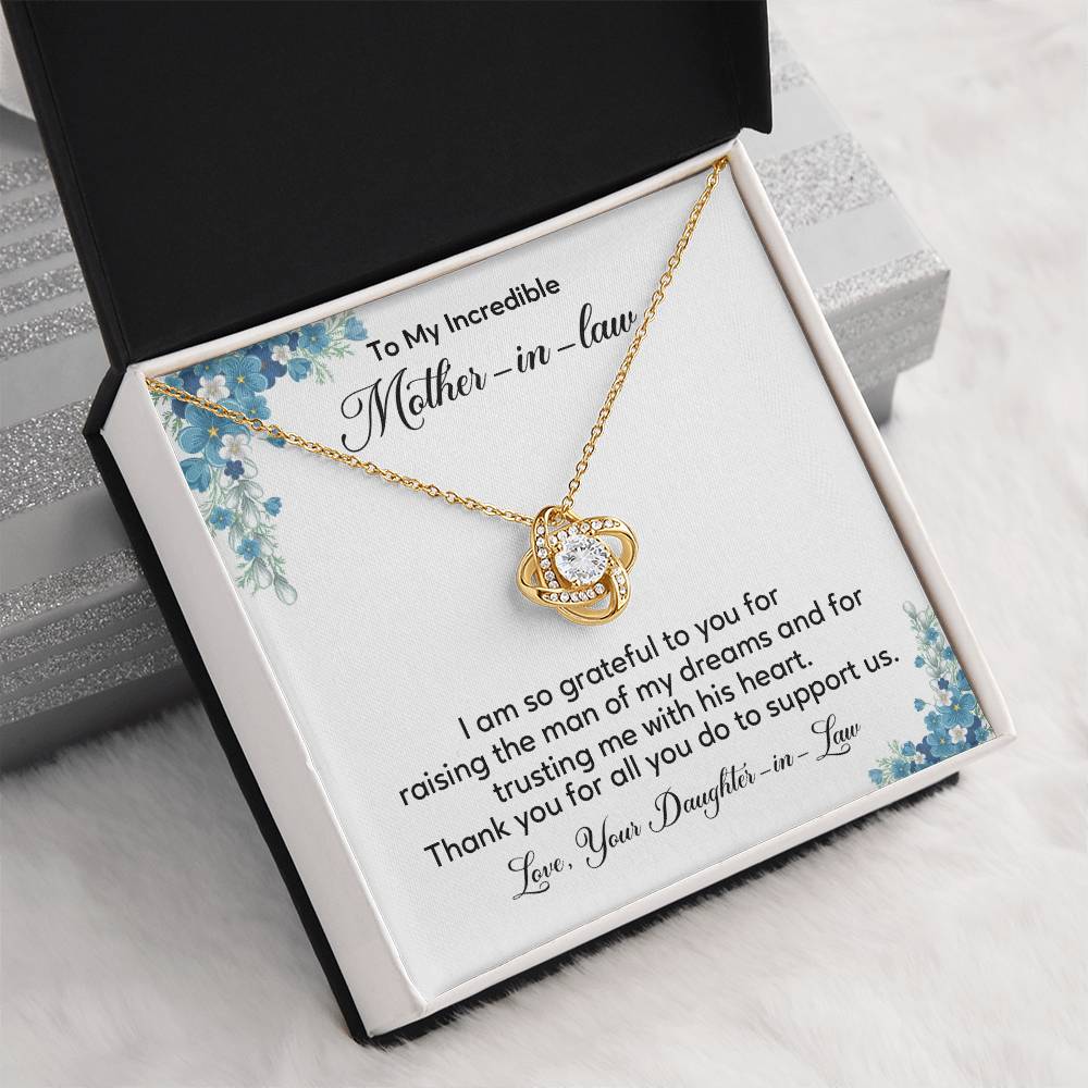 Trying to find a great necklace gift for your mother-in-law? If you want to thank the woman who raised your partner, this lovely love knot necklace is a wonderful idea. For your wedding, her birthday, Christmas or Mother’s Day, this special jewelry is meant for daughters-in-law who wish to show their mother-in-law love and elegance. A gift that will make her mother-in-law very happy and will be remembered for years.
