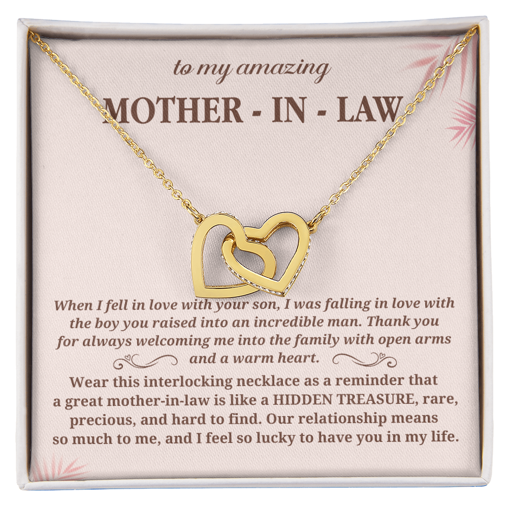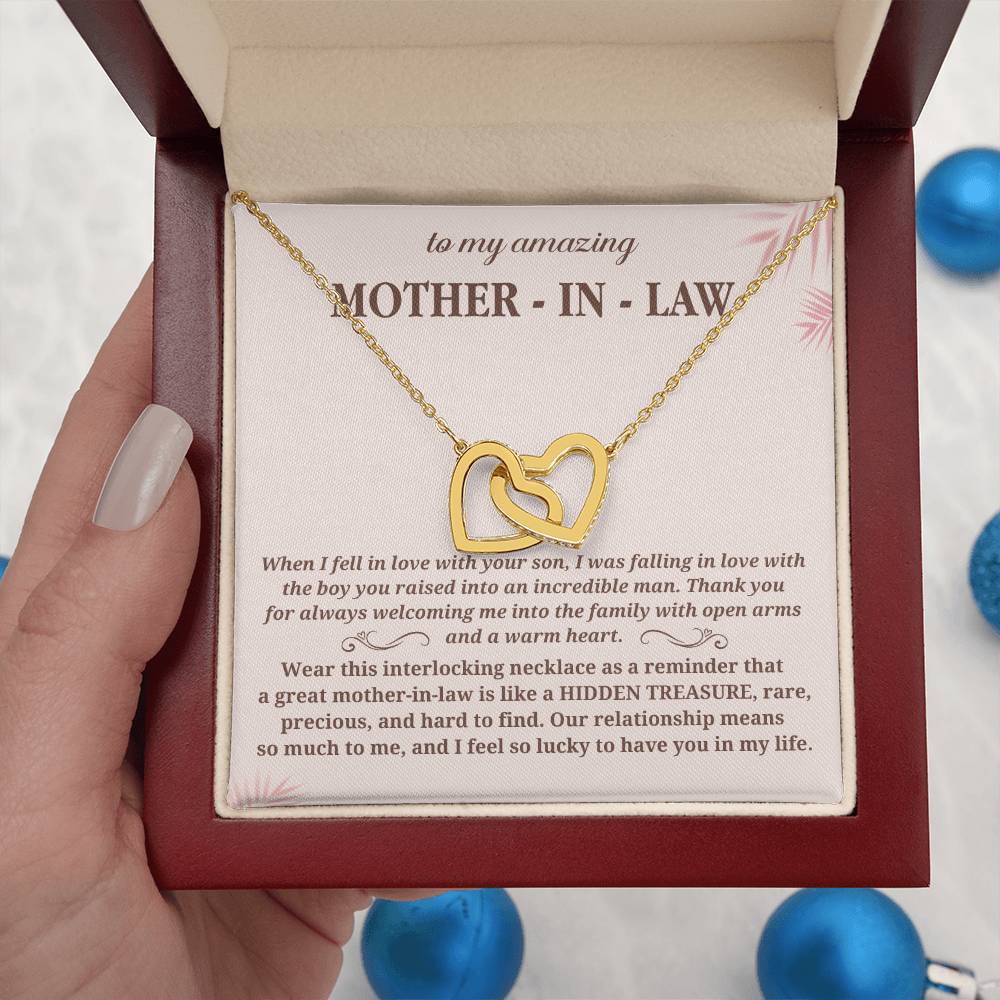 Wear this interlocking necklace as a reminder that a great mother-in-law is like a HIDDEN TREASURE, rare, precious, and hard to find. Our relationship means so much to me, and I feel so lucky to have you in my life."