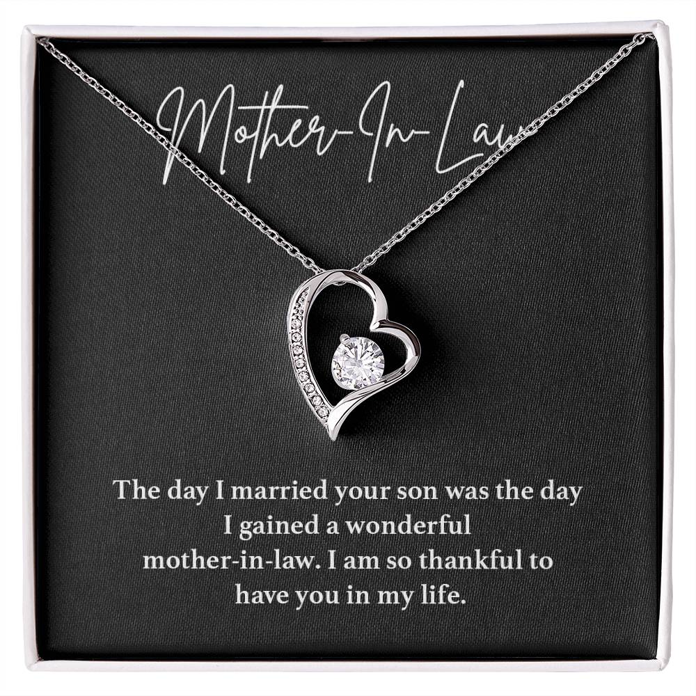 Let your mother-in-law know you’re thankful with this beautiful necklace. This heart-shaped pendant together with a loving message is an ideal gift from a bride to her groom’s mother, to show her how much you appreciate the new relationship.