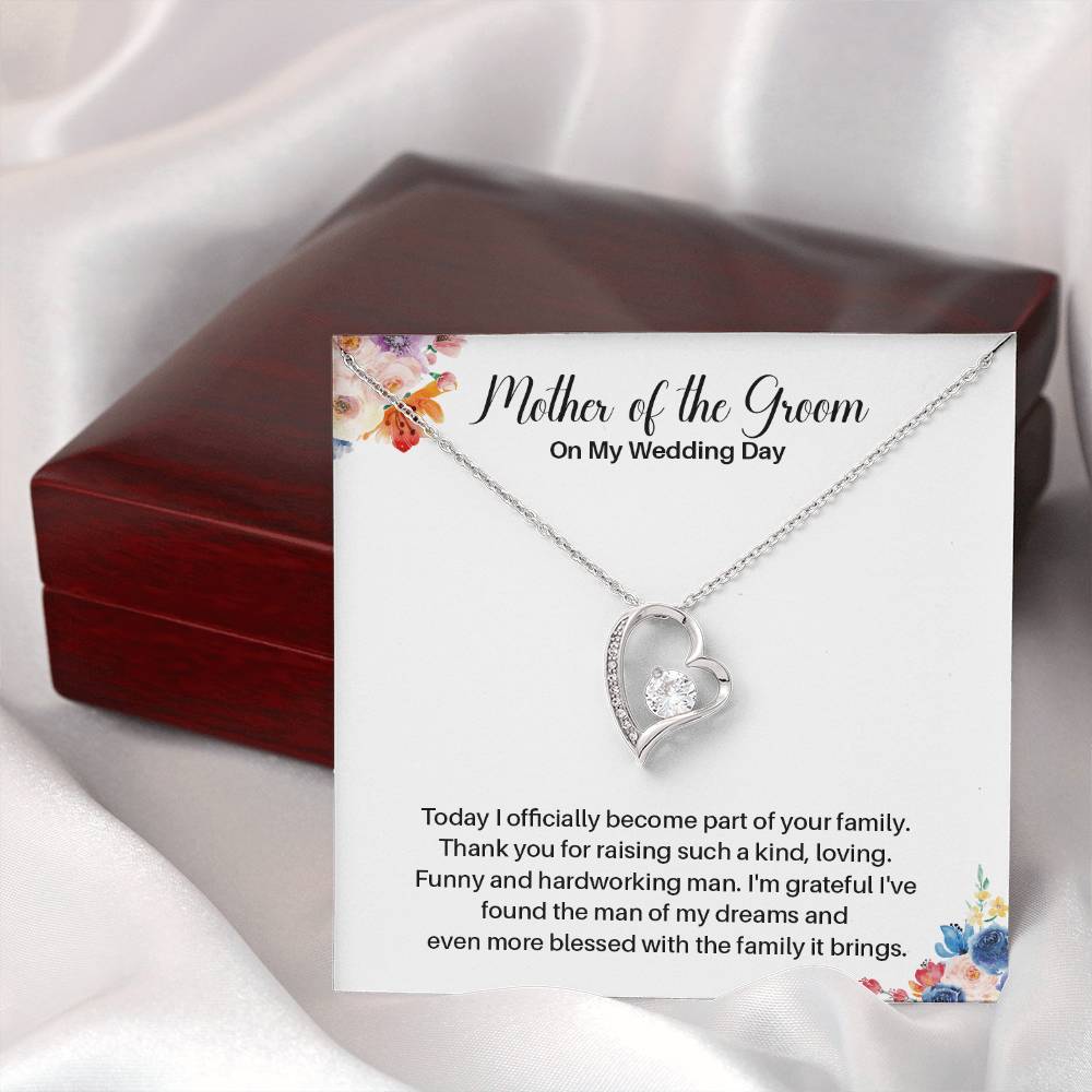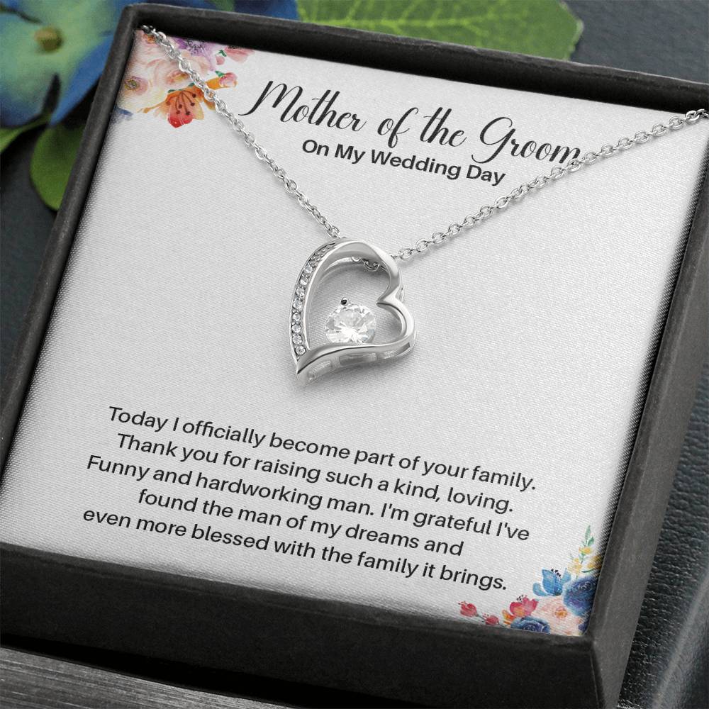 This is a heartwarming wedding day gift to the mother of the groom to celebrate the time when you become an official part of his family. A lovely message card and a beautiful necklace say a lot of gratitude and love to the new mother-in-law by the bride.