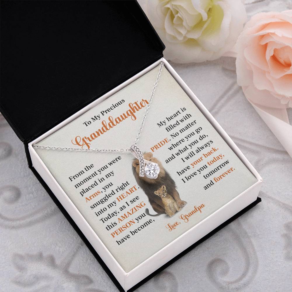 The necklace is a lion work, a strong representation of pride, strength and love given by her grandpa to surprise her granddaughter. This necklace created by grandfather for his granddaughter includes a stunning pendant and encouraging motto which depicts safeguarding/protecting and respect admiration. No matter what you are buying to surprise granddaughter on her birthday, a graduation souvenir, or a heartwarming Christmas gift, lion jewelry gift is the most suitable way to mark your inseparable friendship.