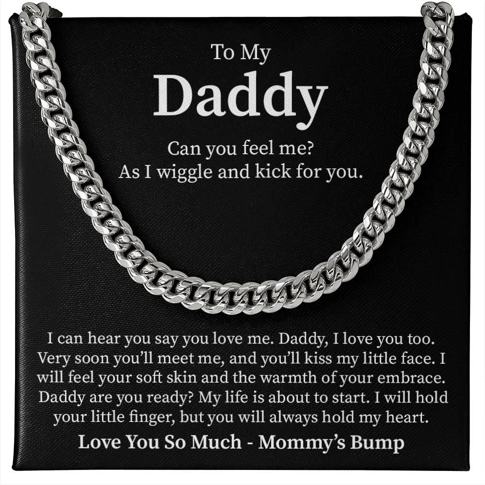 Surprise a soon-to-be daddy with this emotional Cuban Link Chain necklace featuring a tender message from his unborn baby. A perfect keepsake to cherish forever.