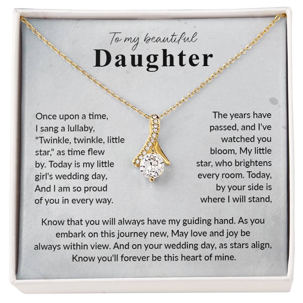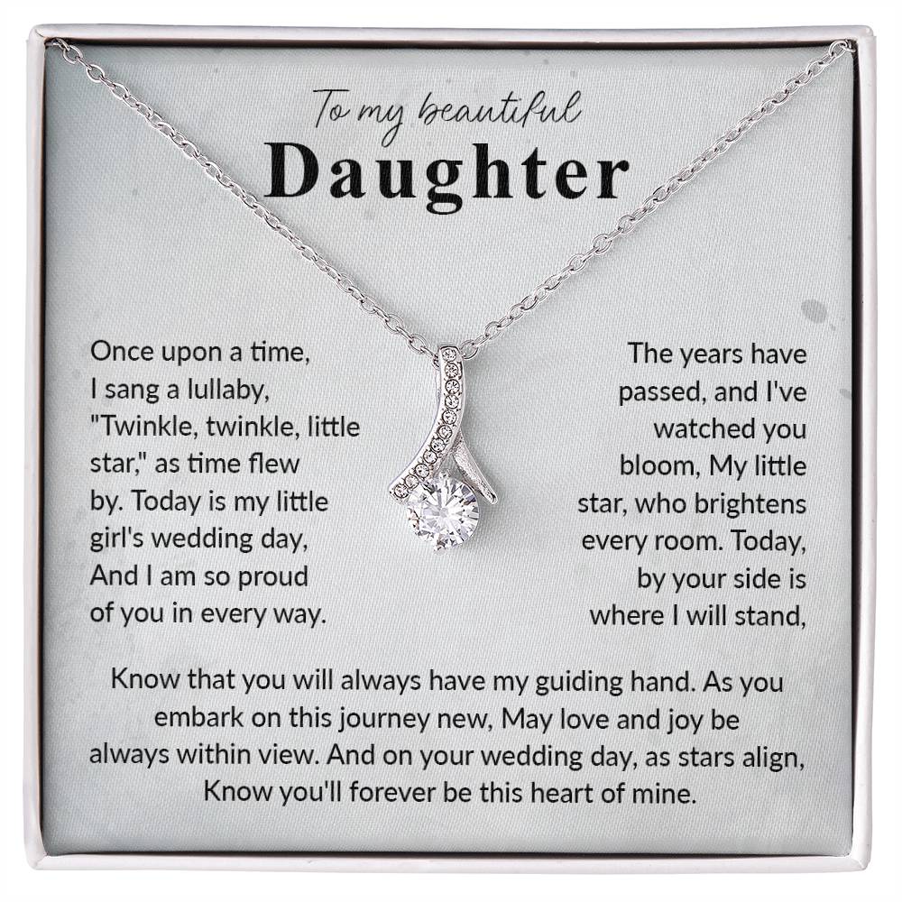 Make sure your daughter feels special on her wedding day with a meaningful wedding day necklace. A sparkling pendant and a thoughtful message card in this keepsake wish her luck as she begins her new life and reminds her you will always see her as your little girl.