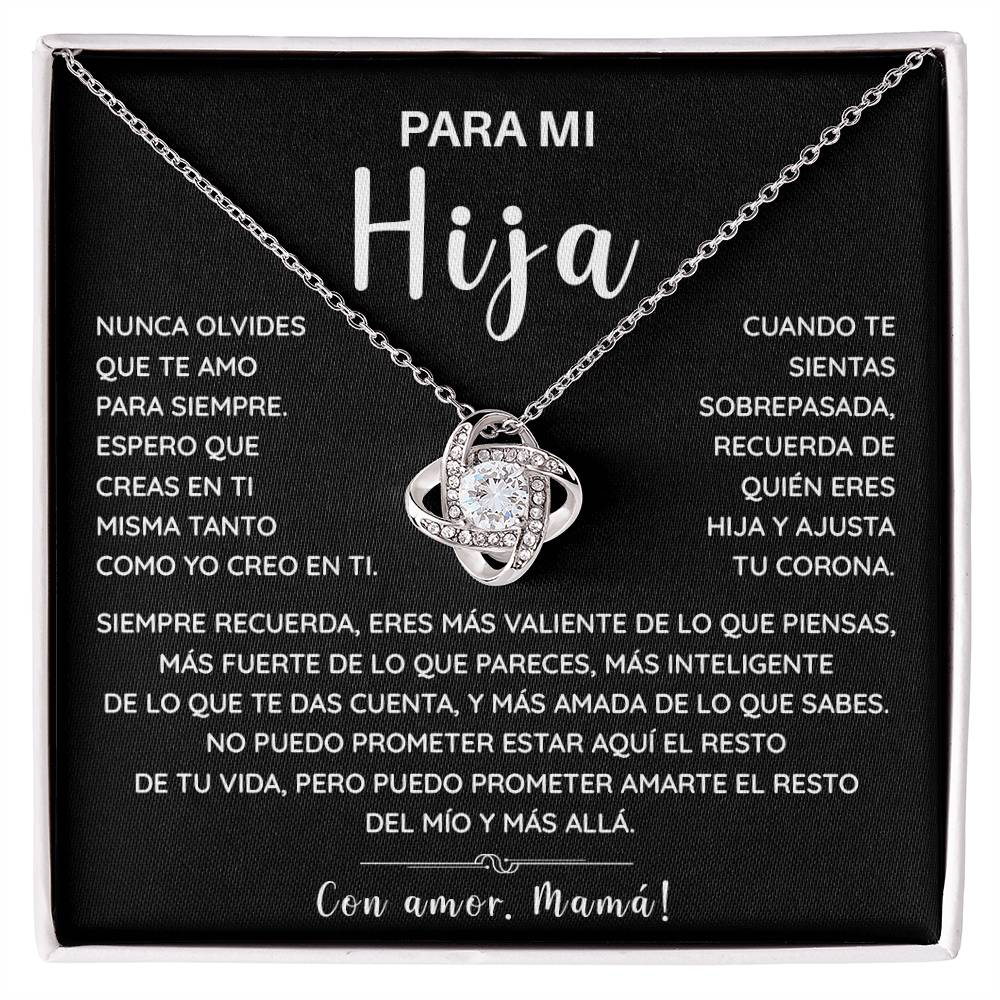 Decelev a tu hija con este collar lleno de amor y palabras que tocan el alma. Con un hermoso dije de nudo brillante y una tarjeta con un mensaje fuerte de mamá, este regalo es un diálogo eterno de apoyo, fe y amor incondicional.
