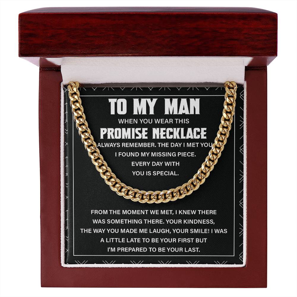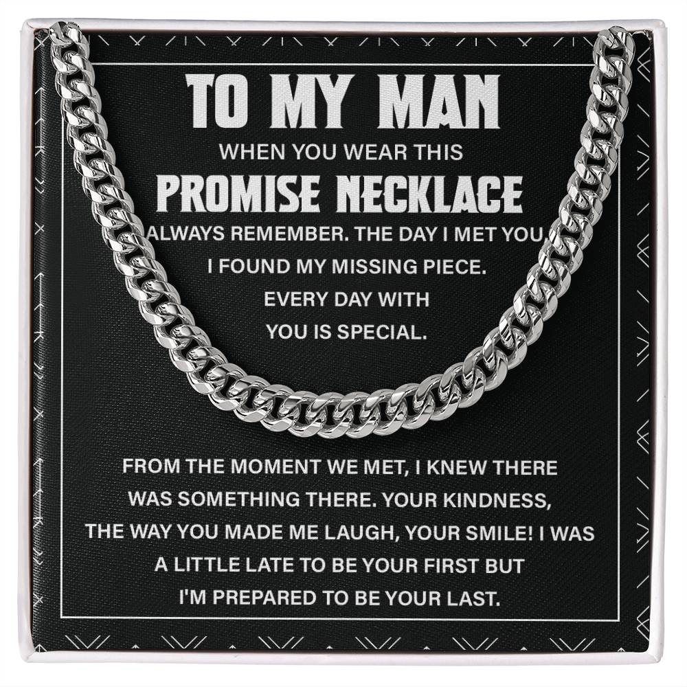 This promise necklace of Cuban links will make a great gift to the man who completes your heart. This sleek piece is meant to be given to boyfriends, husbands or partners with a heartfelt message card that says how special he is. An effective anniversary, birthday or just because gift.