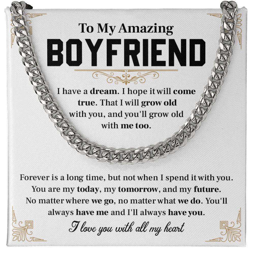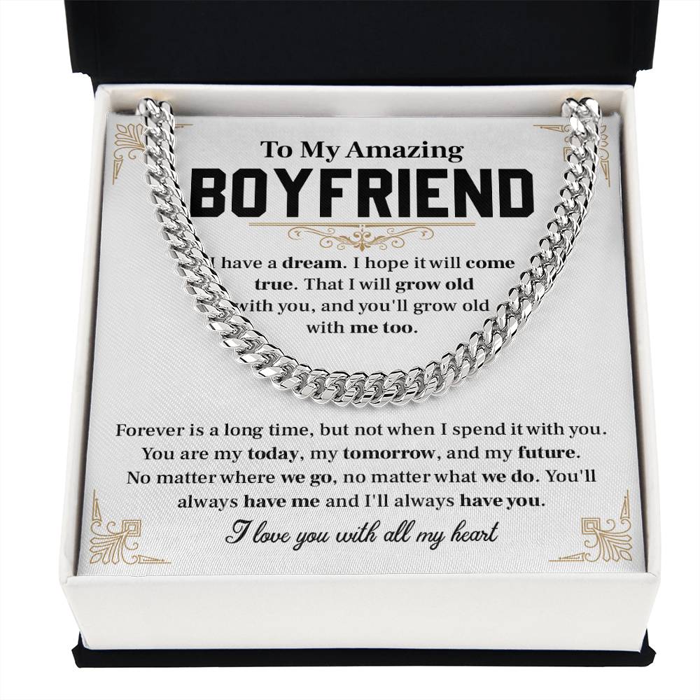 Share your passion of adventure and your boyfriend with this special Cuban chain necklace a thoughtful camping gift to him. This boyfriend necklace is ideal as a romantic gift to give to your loved one on his birthday, anniversary or even on Valentine Day since it comes with a heartfelt message card that will warm the heart of your loved one. Be it your hiking partner or tent mate, make him understand that he is your lifetime adventure partner.