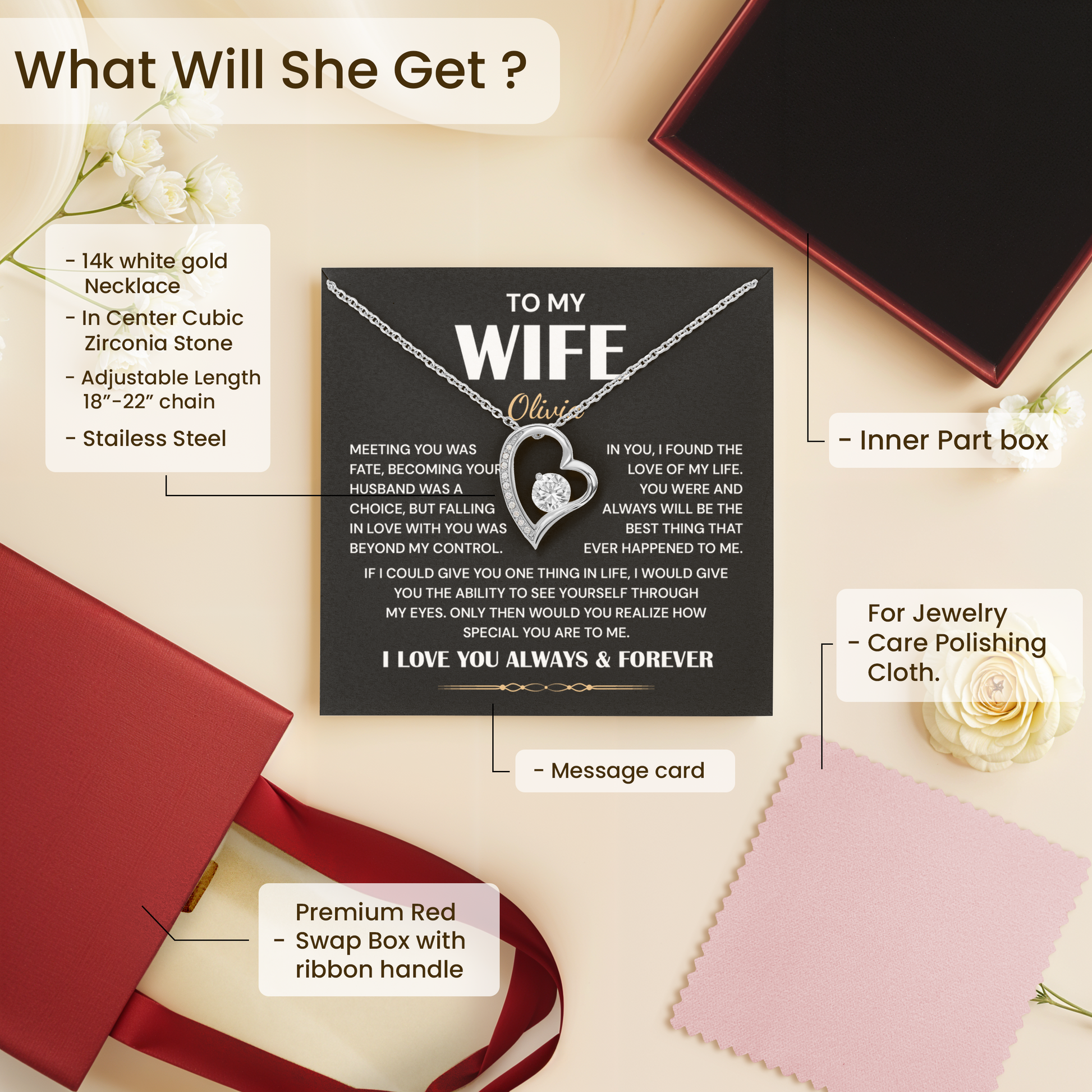 With this romantic heart necklace and a heartfelt "To My Wife" message card, you may honor the woman who transformed your life. For any husband who want to make his wife feel valued, this is the right approach to convey thankfulness, destiny, and unconditional love.