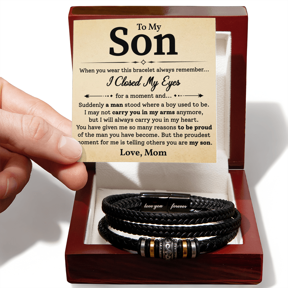 Celebrate the incredible journey from boy to man with this heartfelt leather bracelet gift for your son. Featuring a touching "I Closed My Eyes" message card, this keepsake is a timeless reminder of your everlasting love and pride.