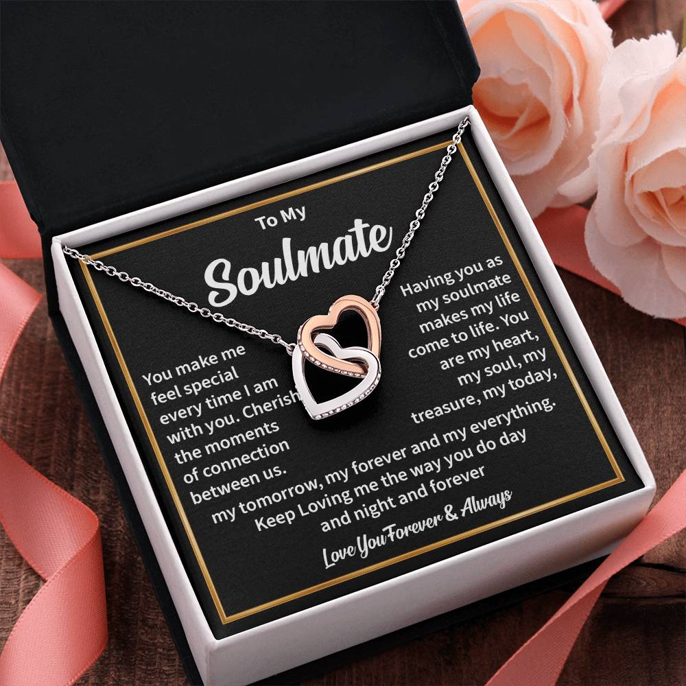 Express your love to your soulmate with this gorgeous interlocking hearts necklace to her. This romantic necklace is a great gift to give someone on an anniversary, a valentine surprise or just because I love you gift. With a touching message card and a beautiful gift box, it can be a perfect choice of those who want to find a soulmate jewelry to girlfriend or wife.